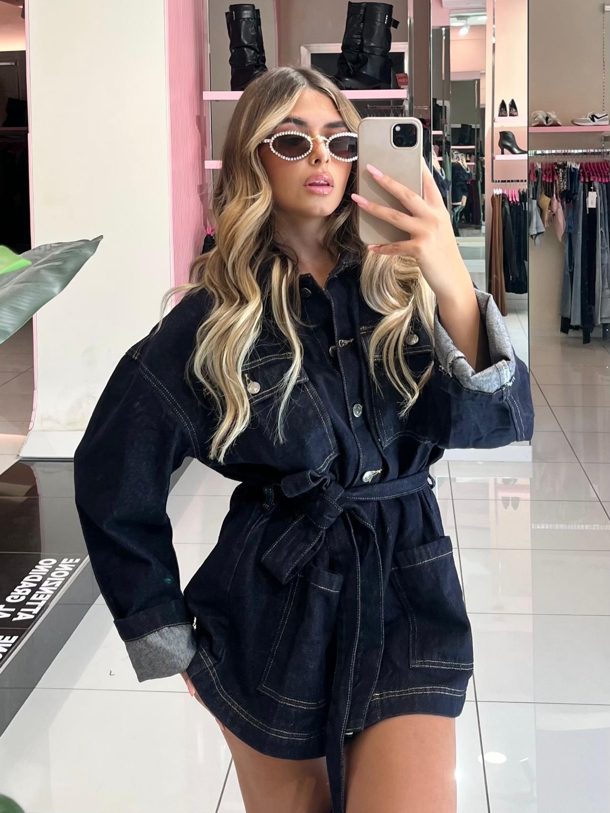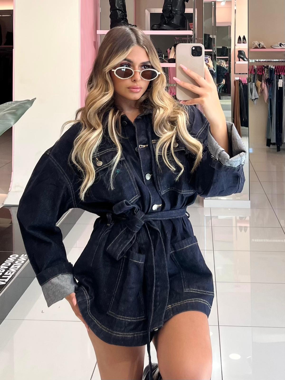Maxi giacca denim scuro con tasche bottoni e cinturino