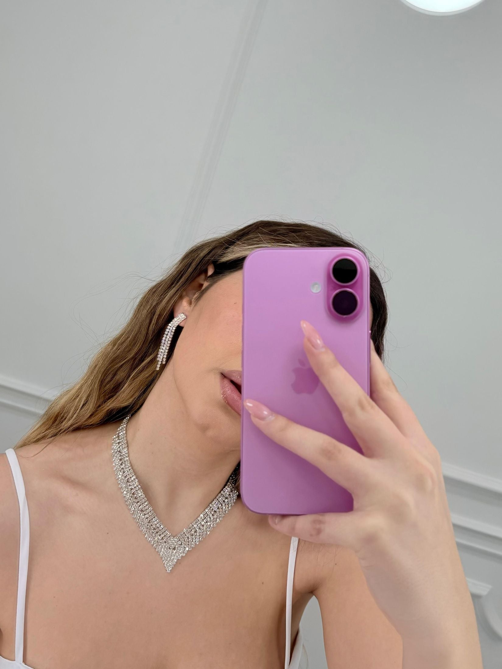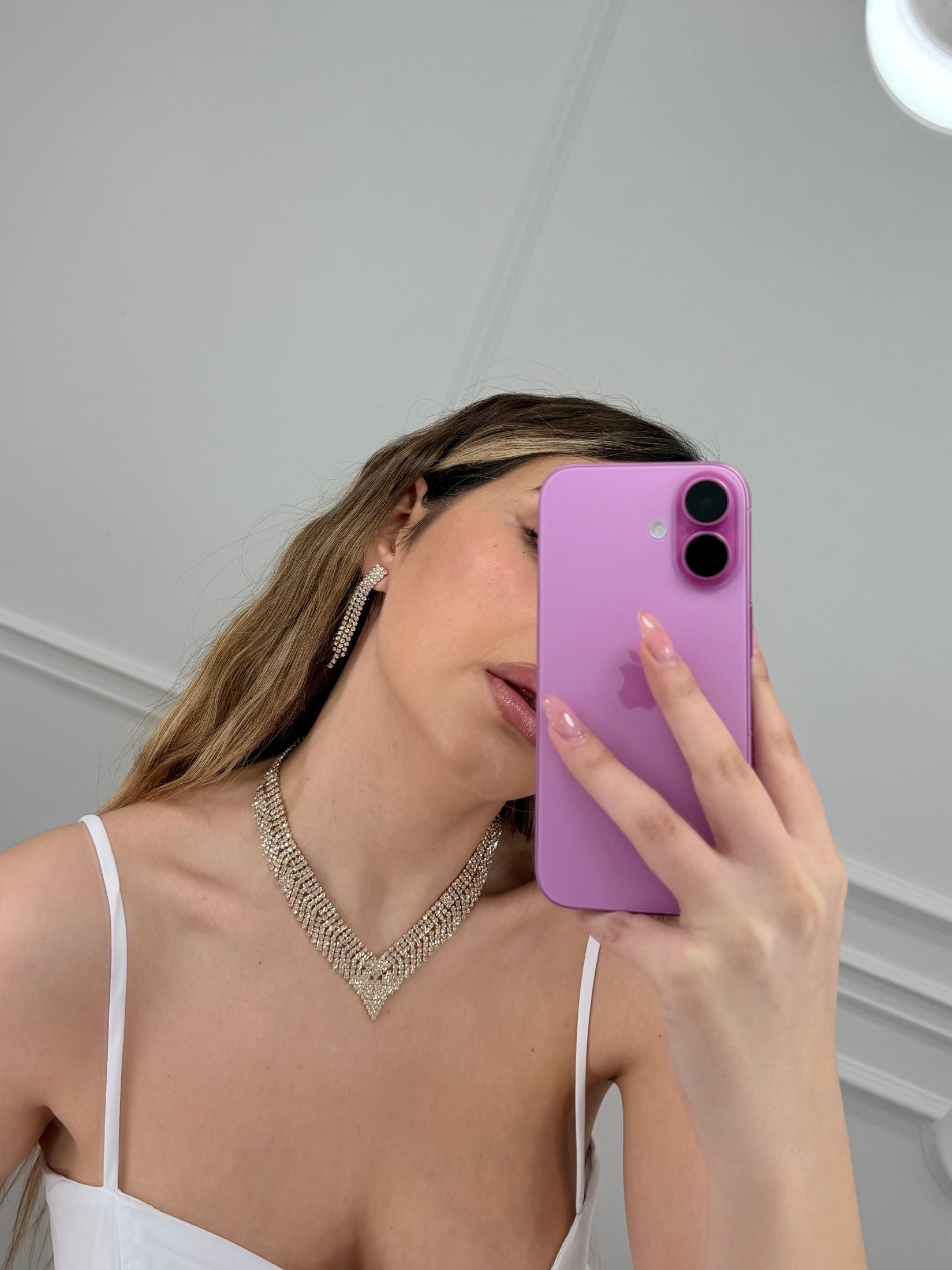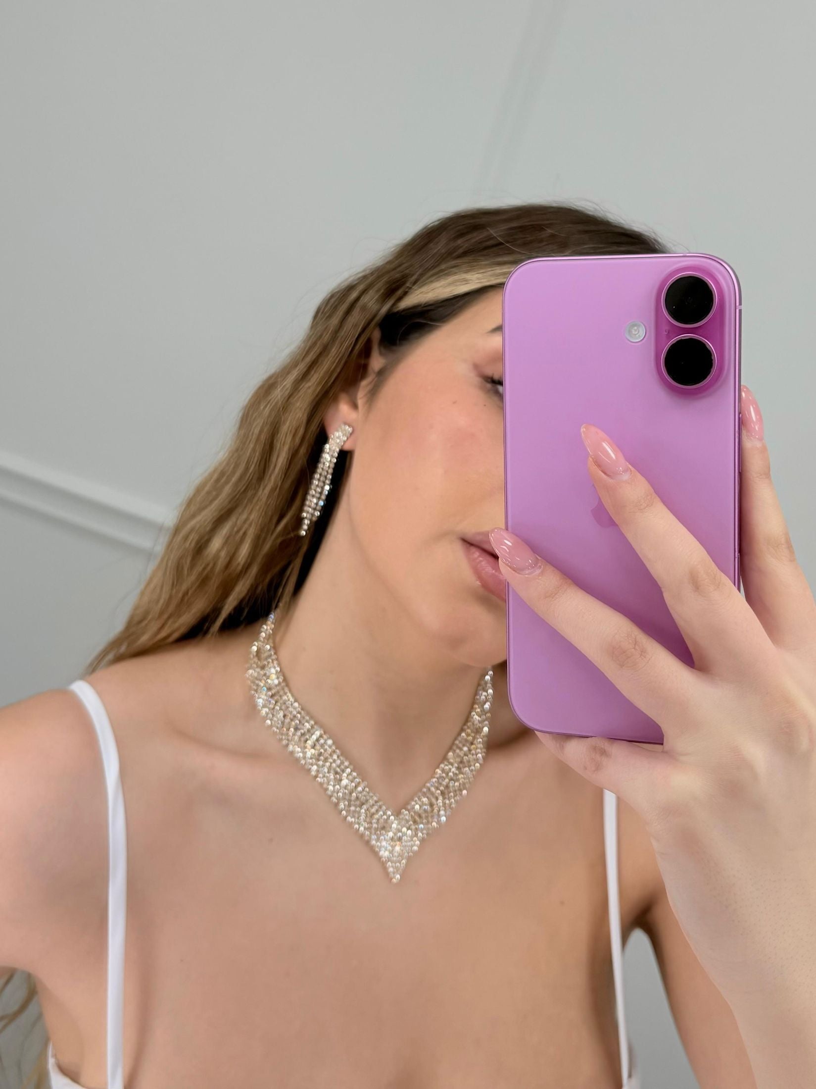 Set composto da coppia di precchini pendenti e collana con gancio strass