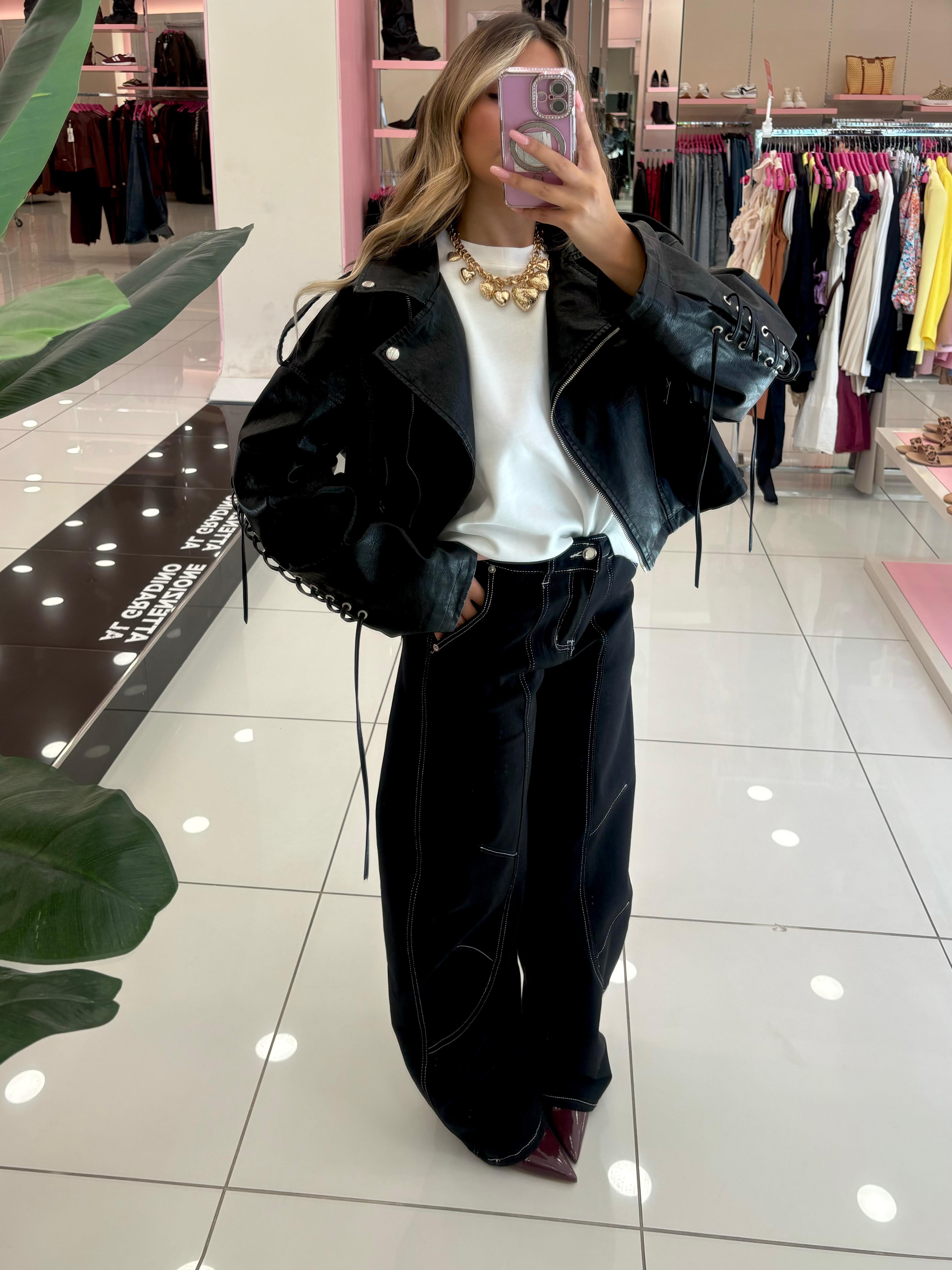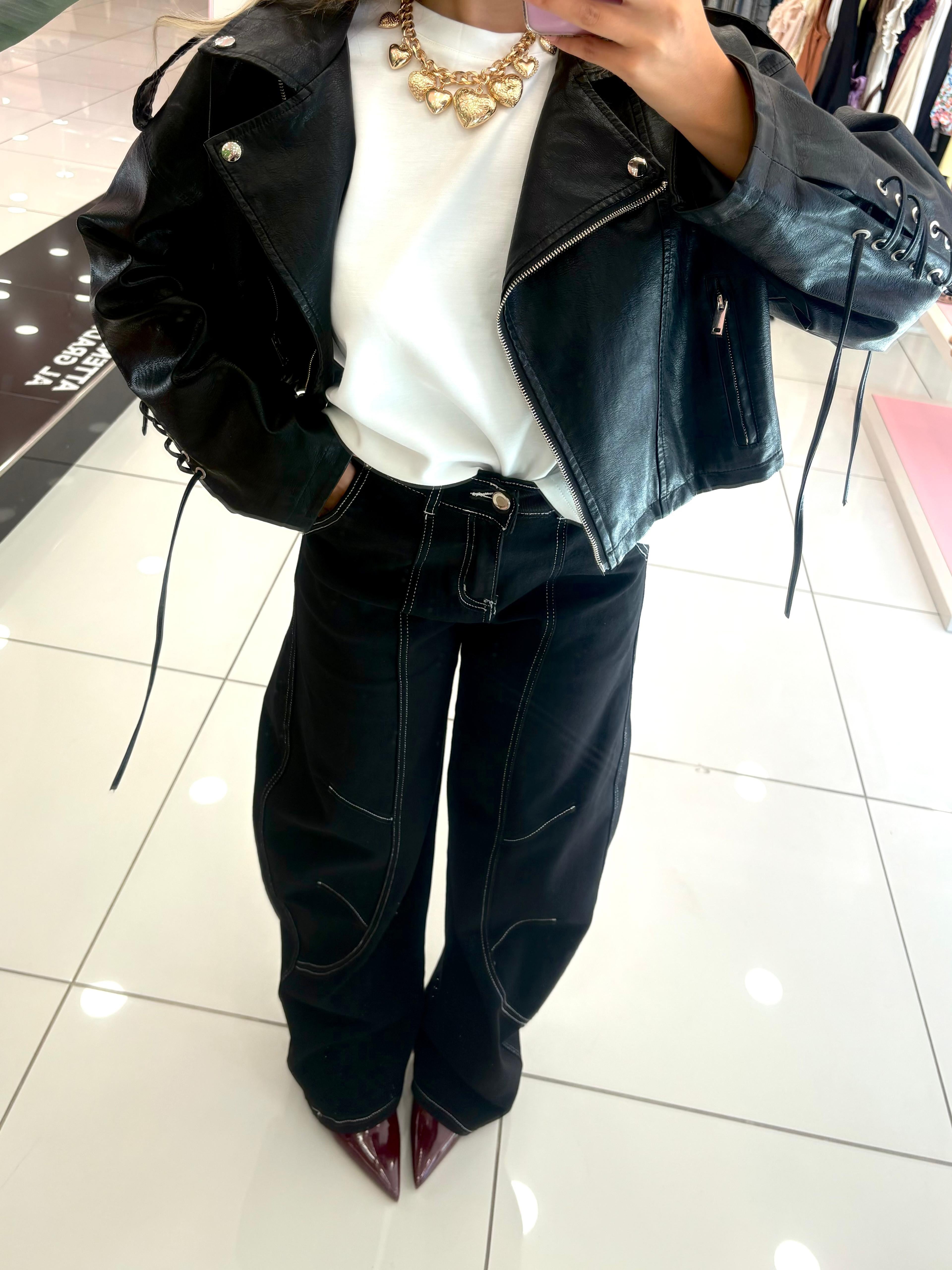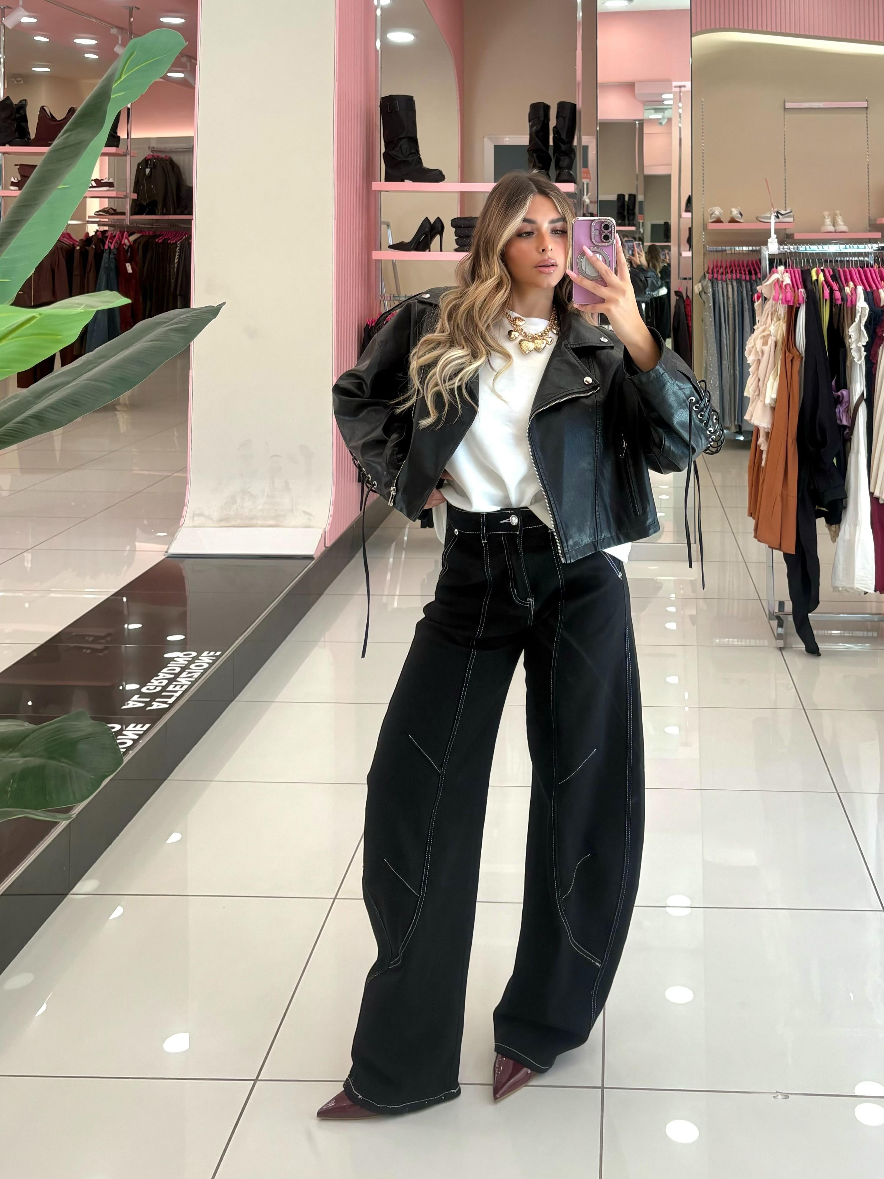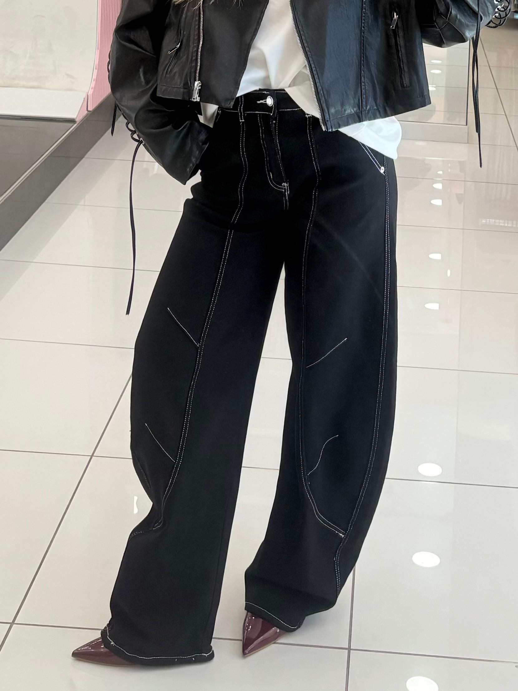 Jeans ballon nero con cuciture bianche tasche e bottone