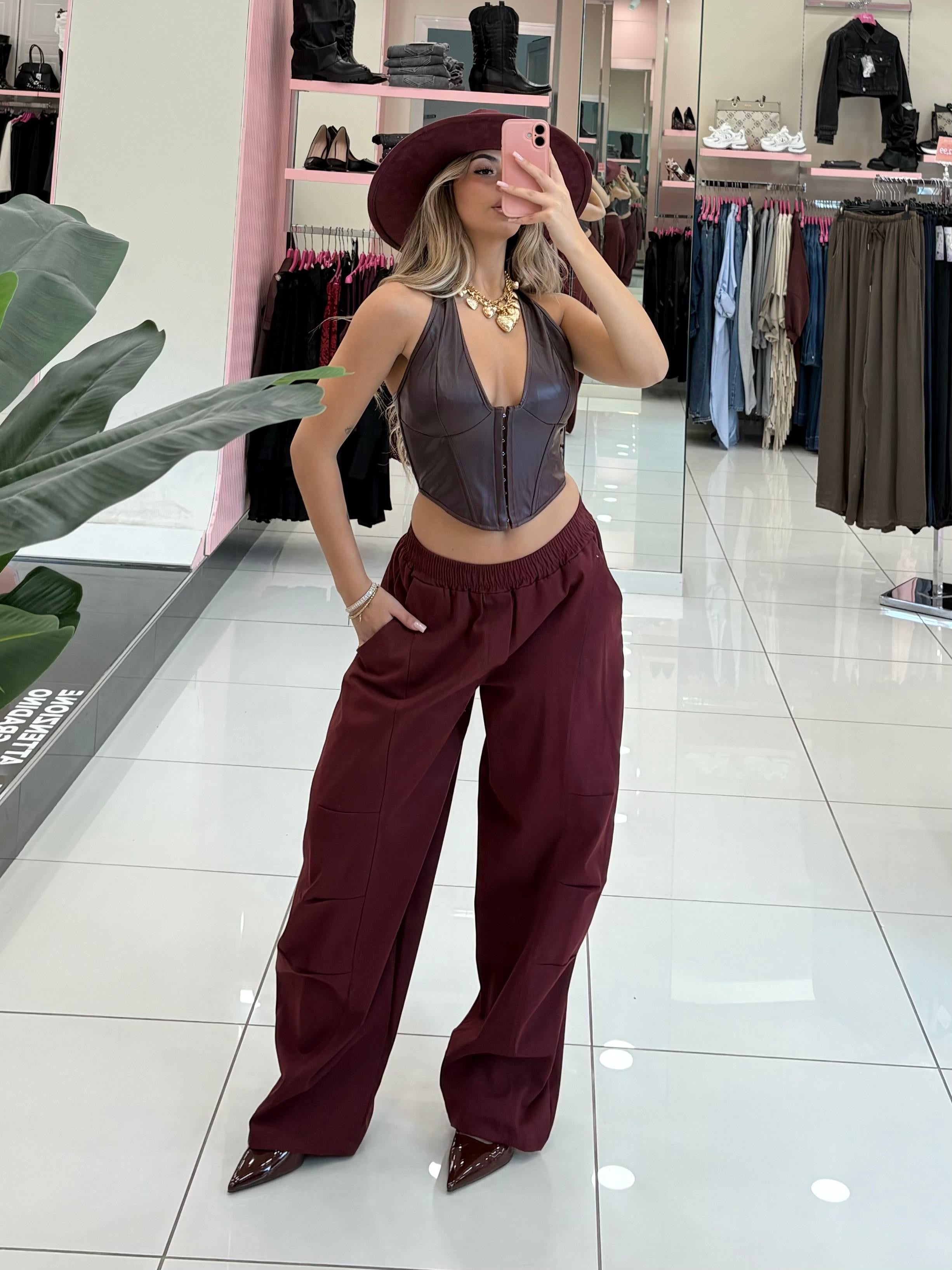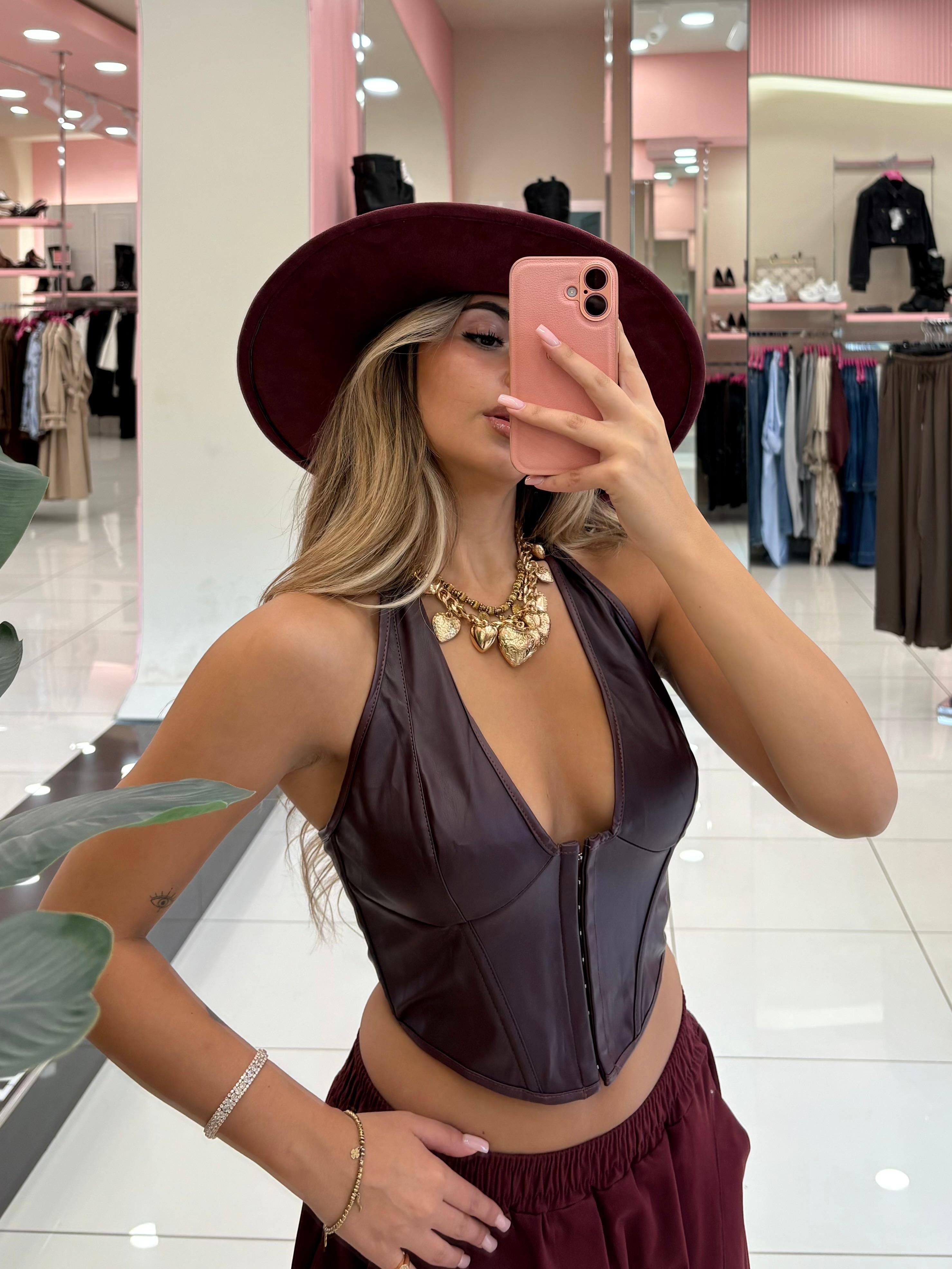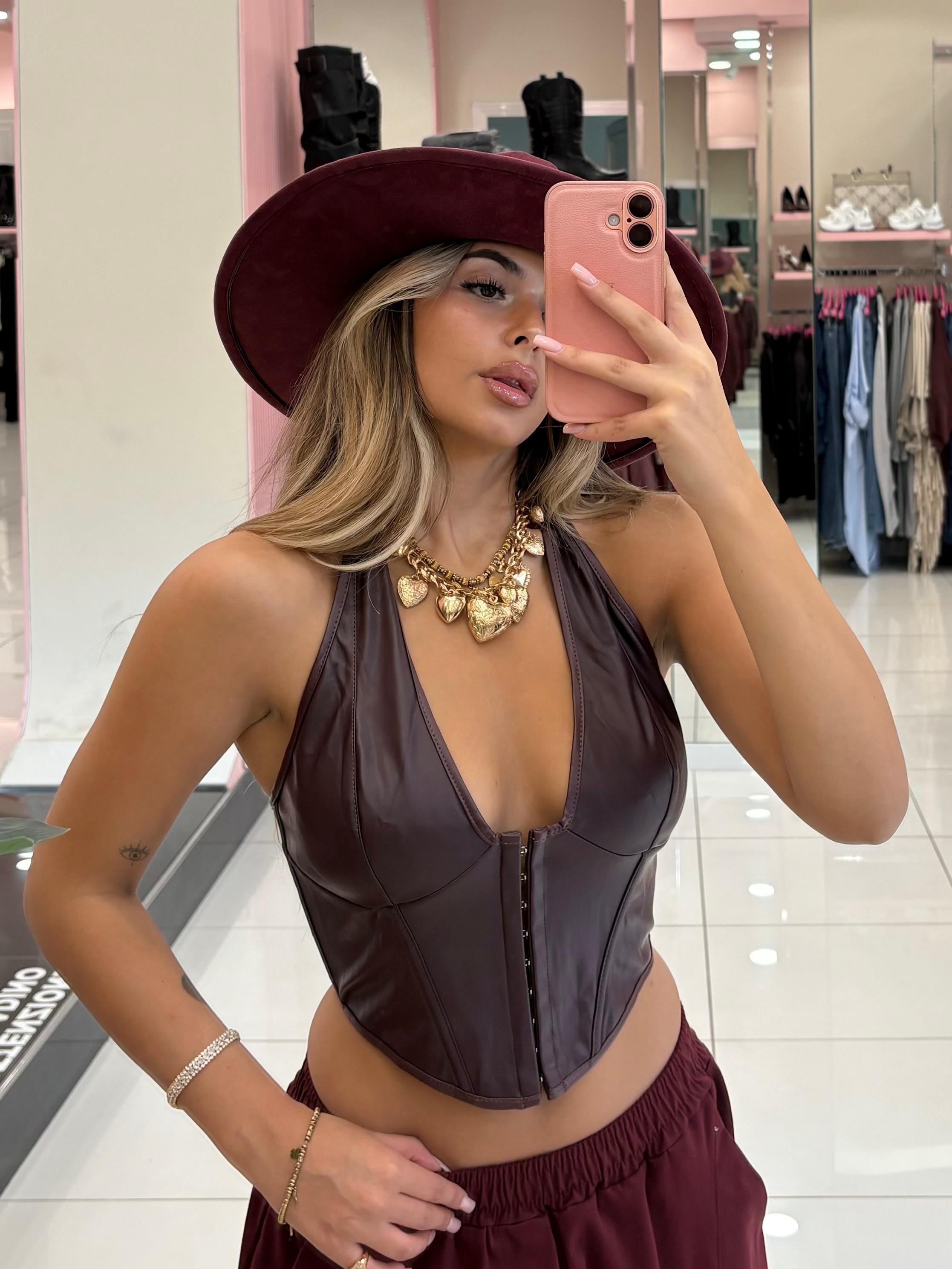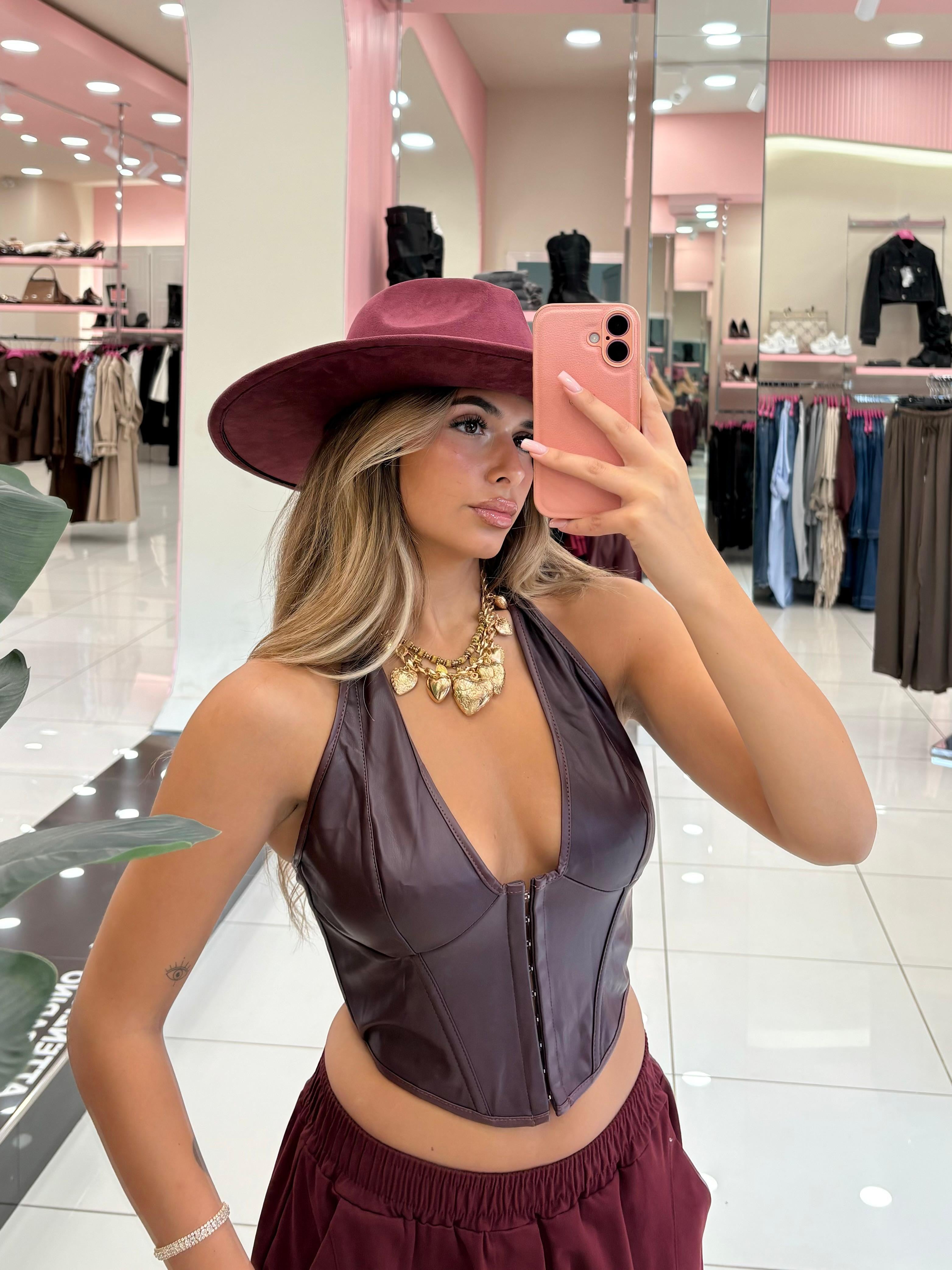 Top ecopelle, gancetti anteriori, laccetti regolabili posteriori e bottoni retro collo