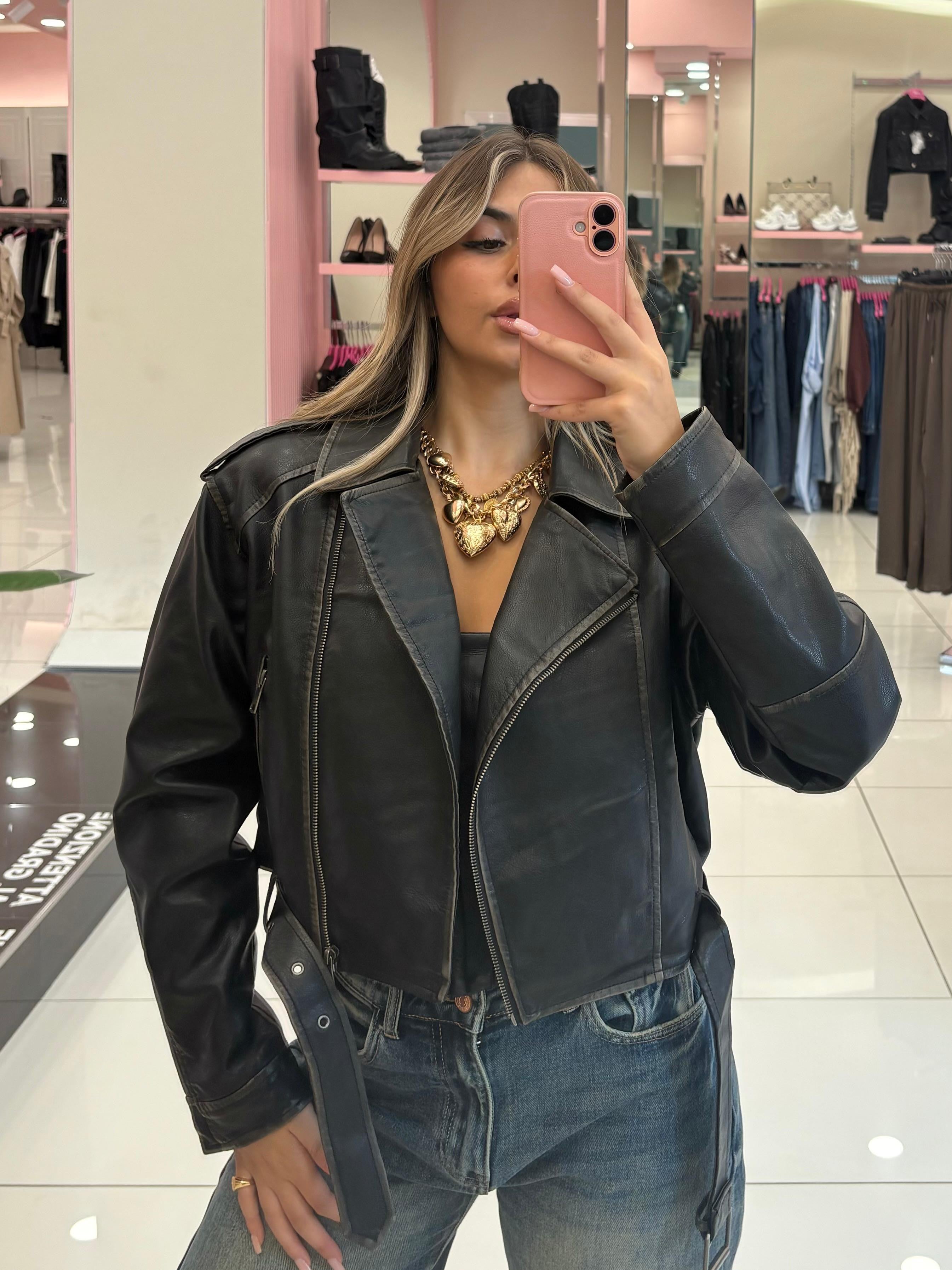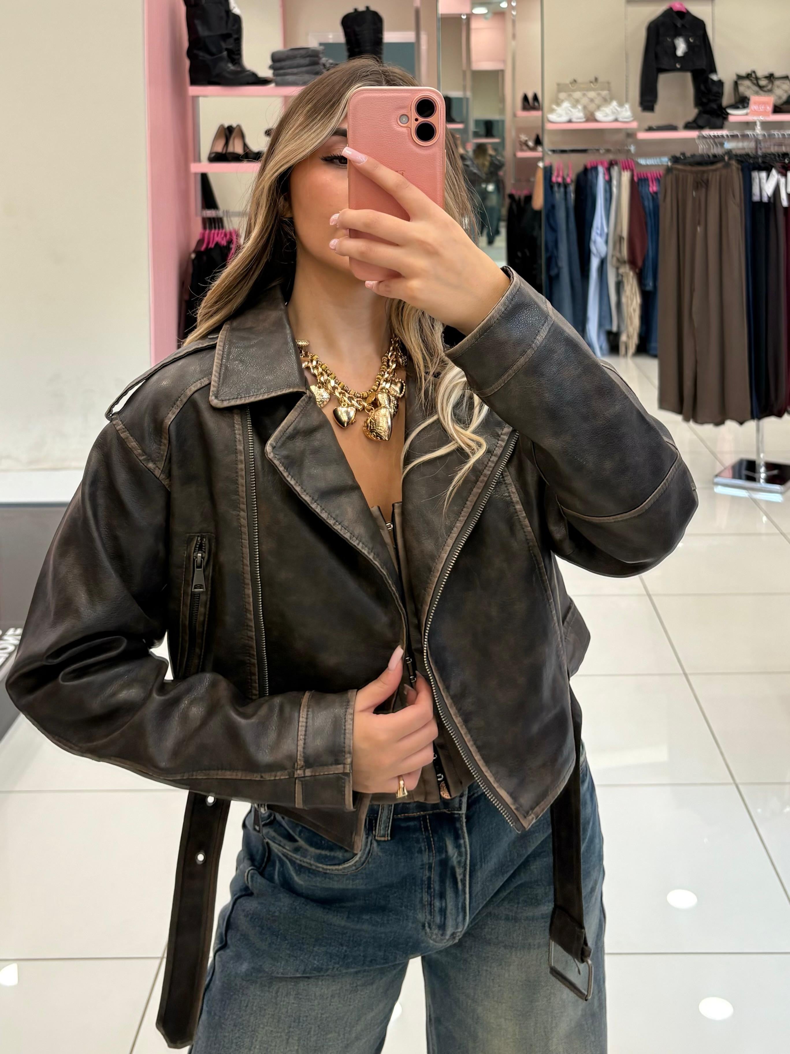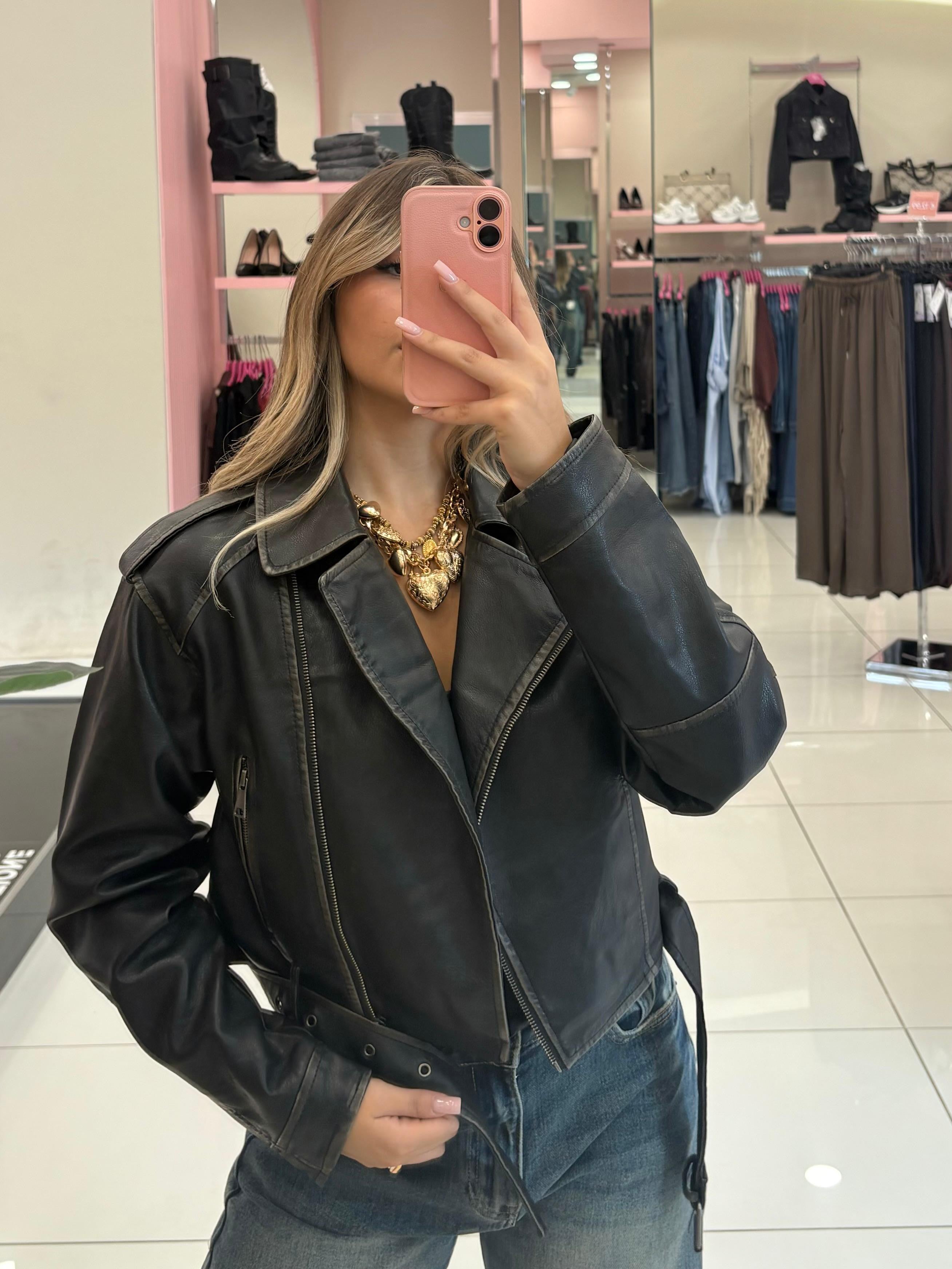 Chiodo ecopelle effetto vintage, chiusura zip bottoni, tasche e cinturino