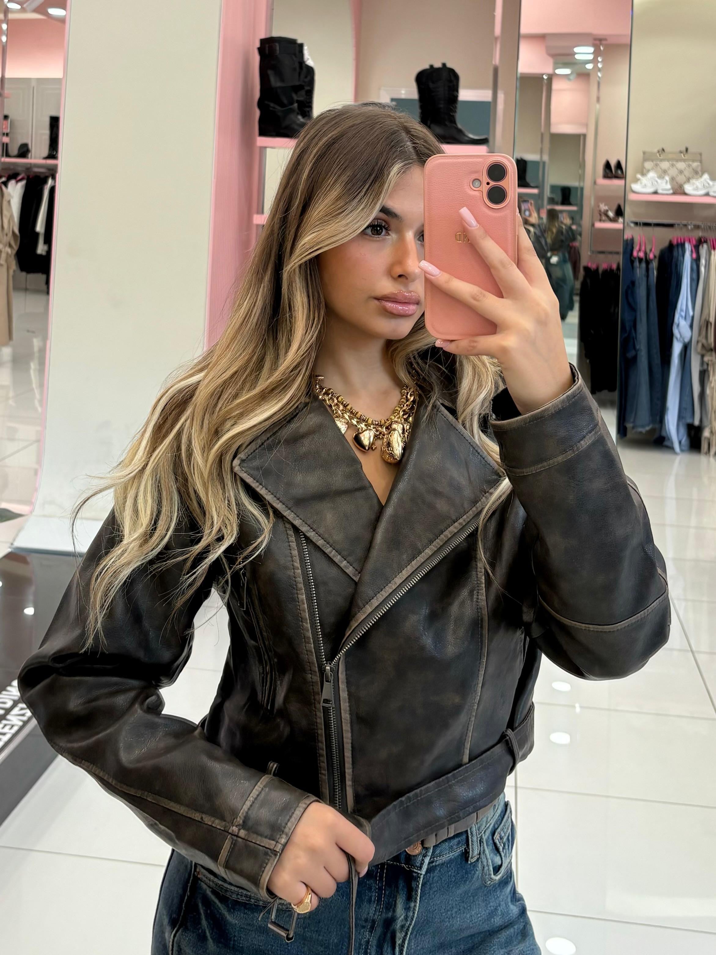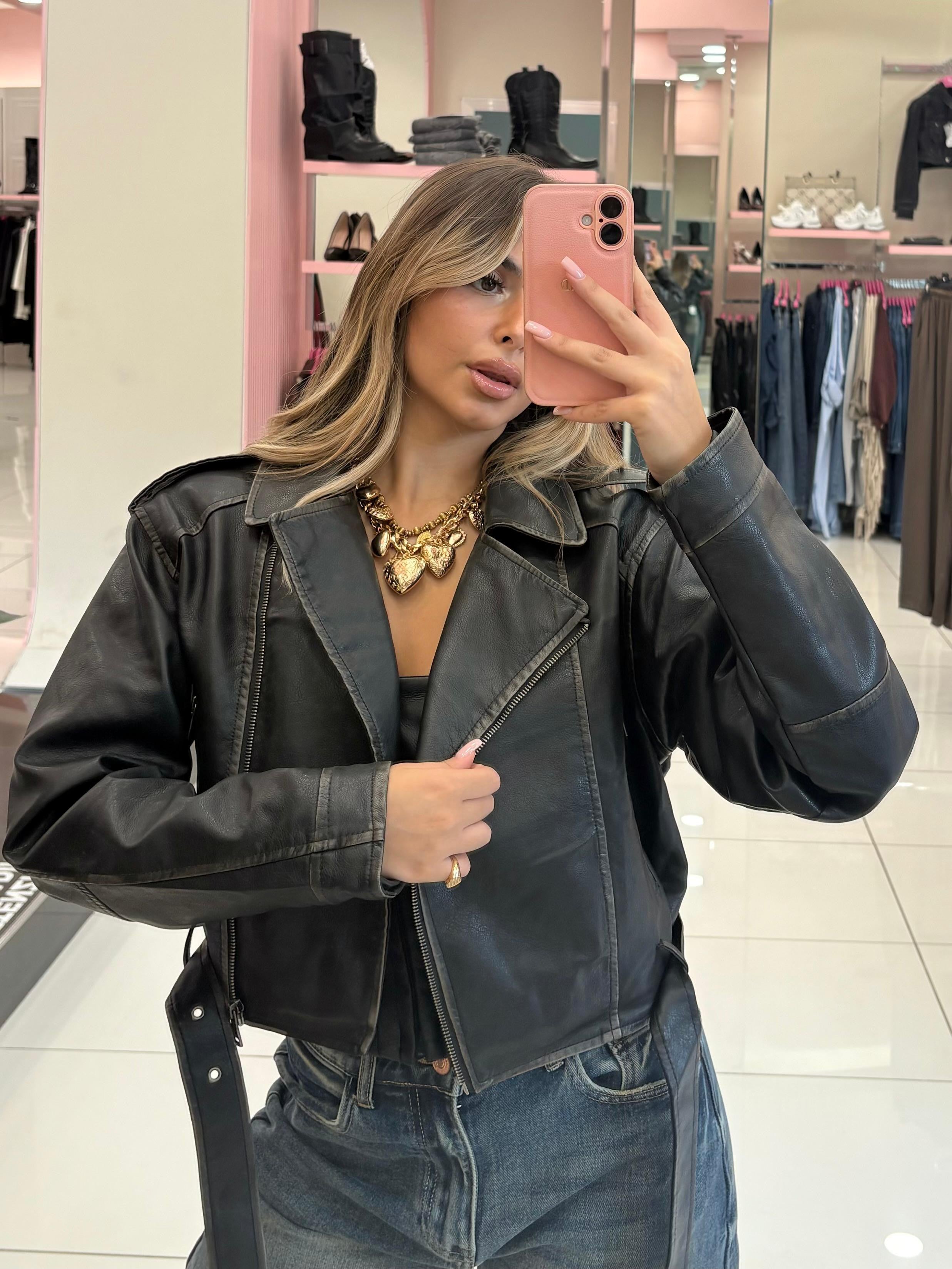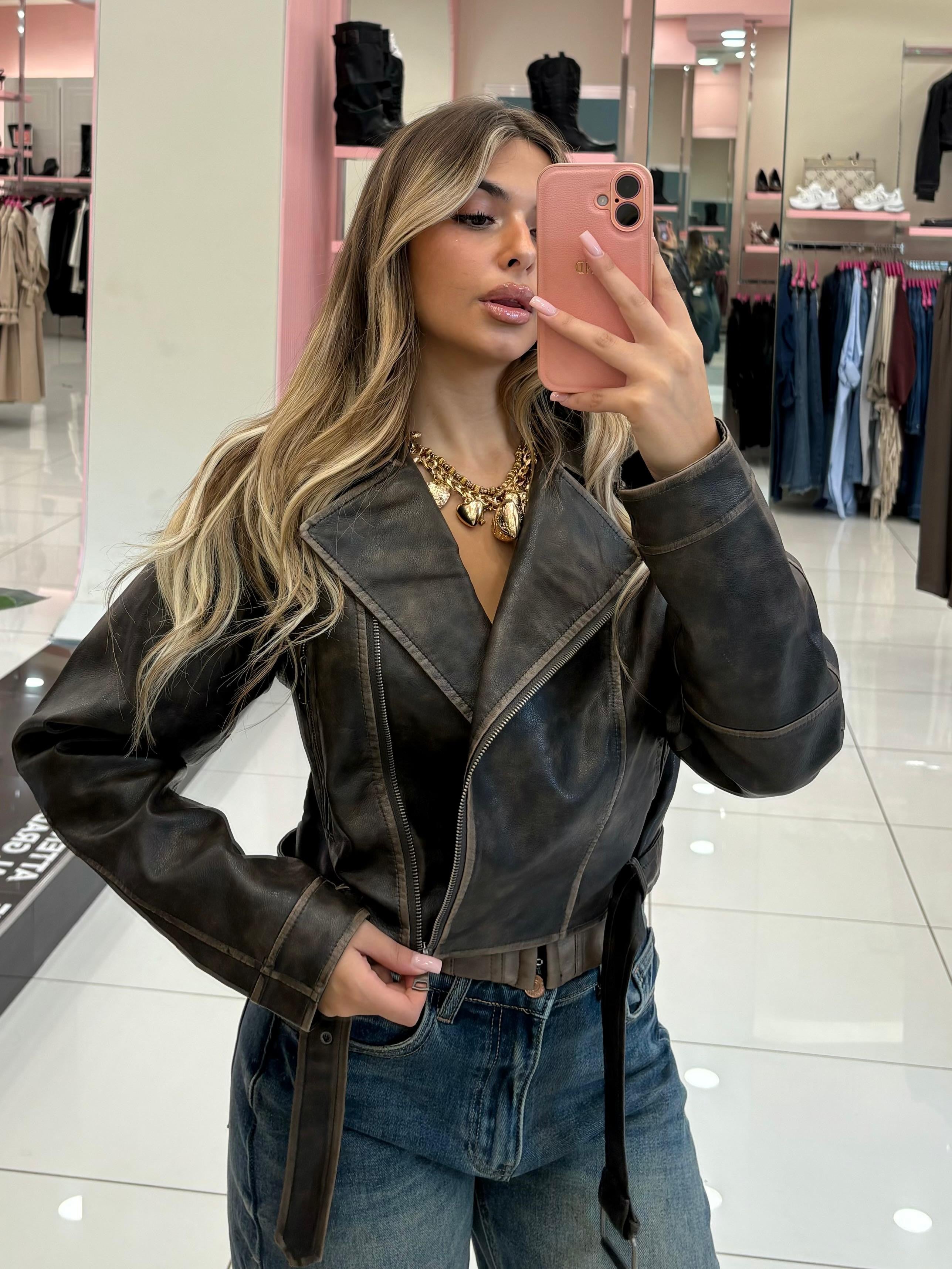 Chiodo ecopelle effetto vintage, chiusura zip bottoni, tasche e cinturino