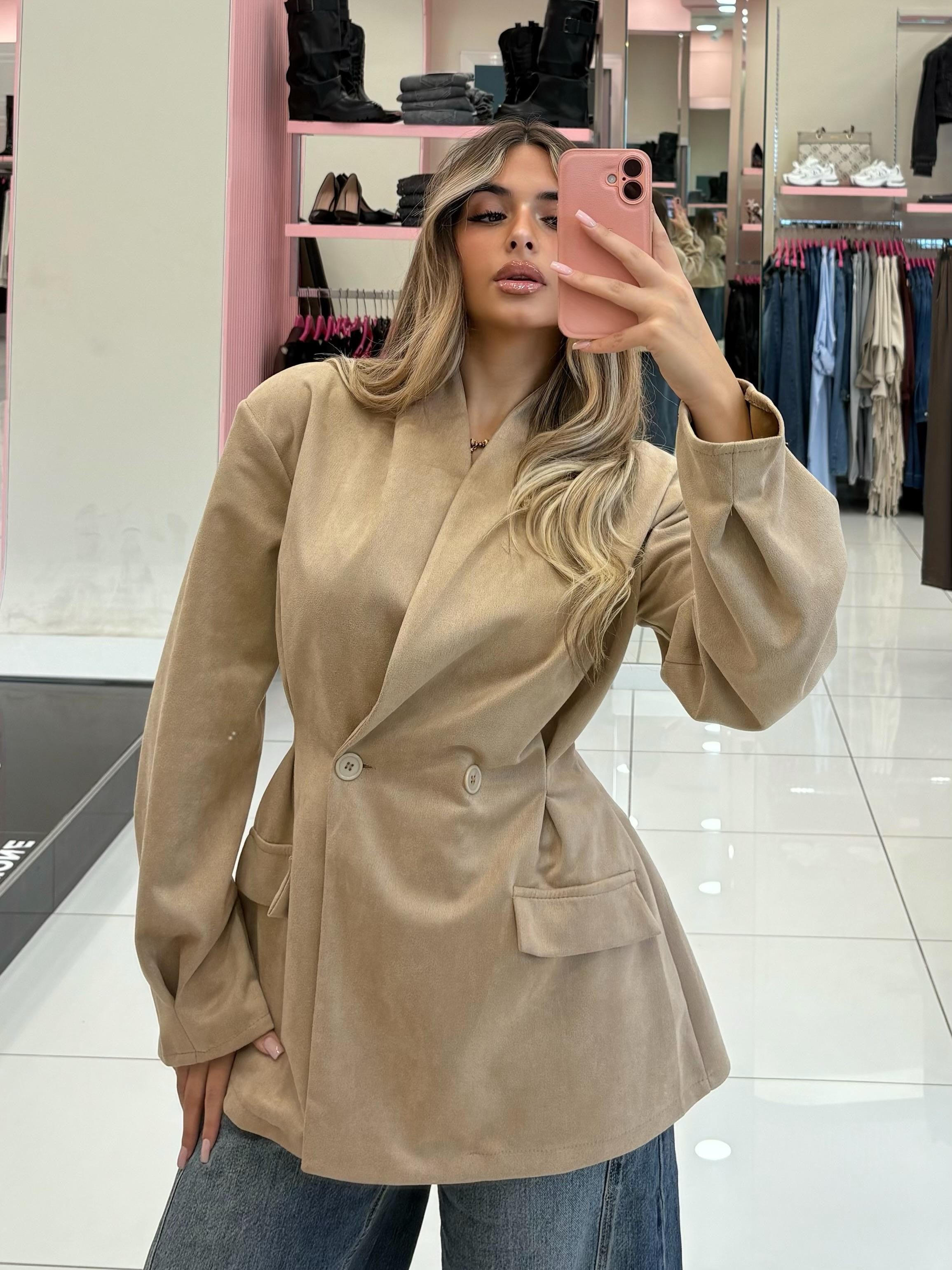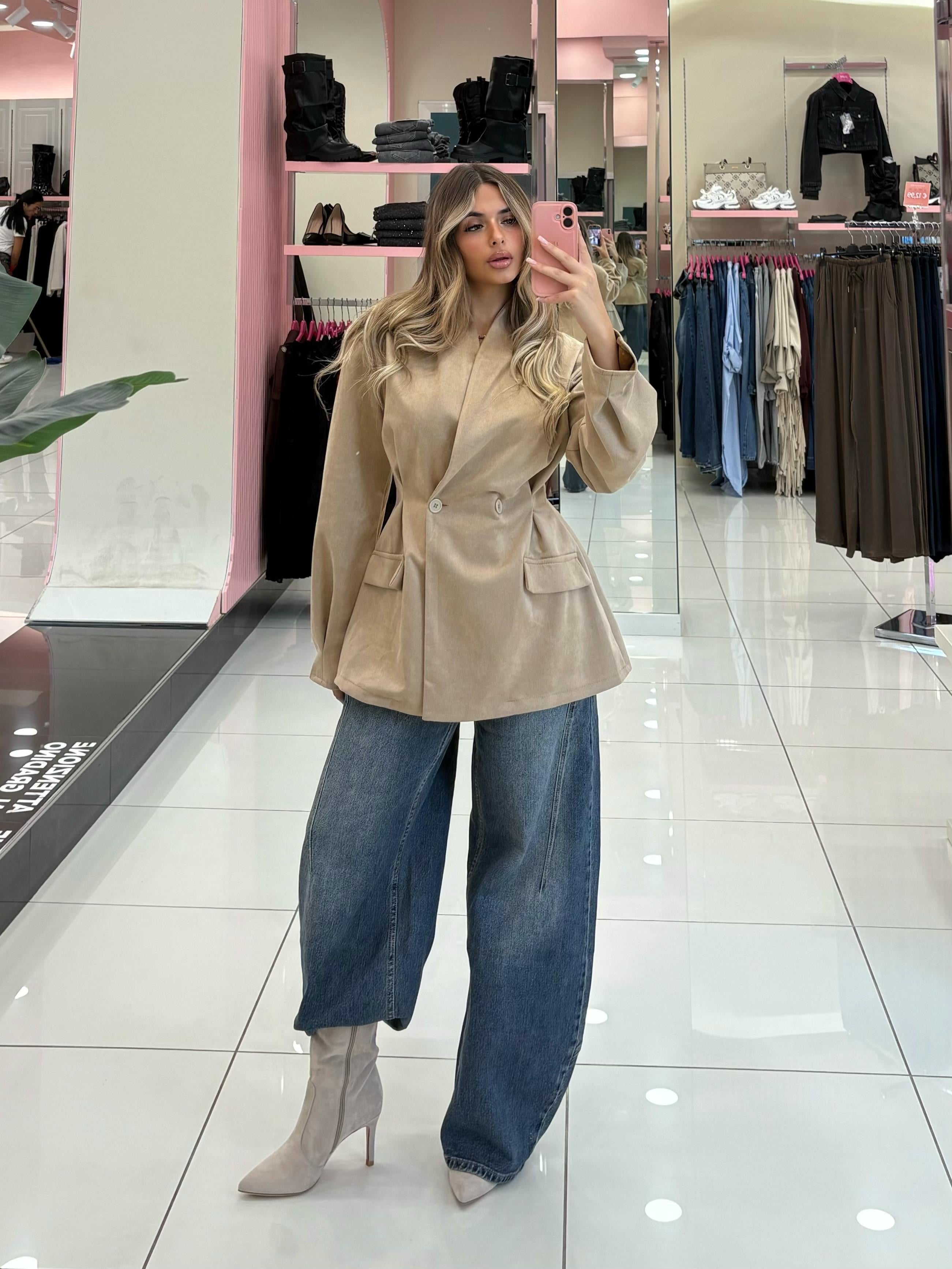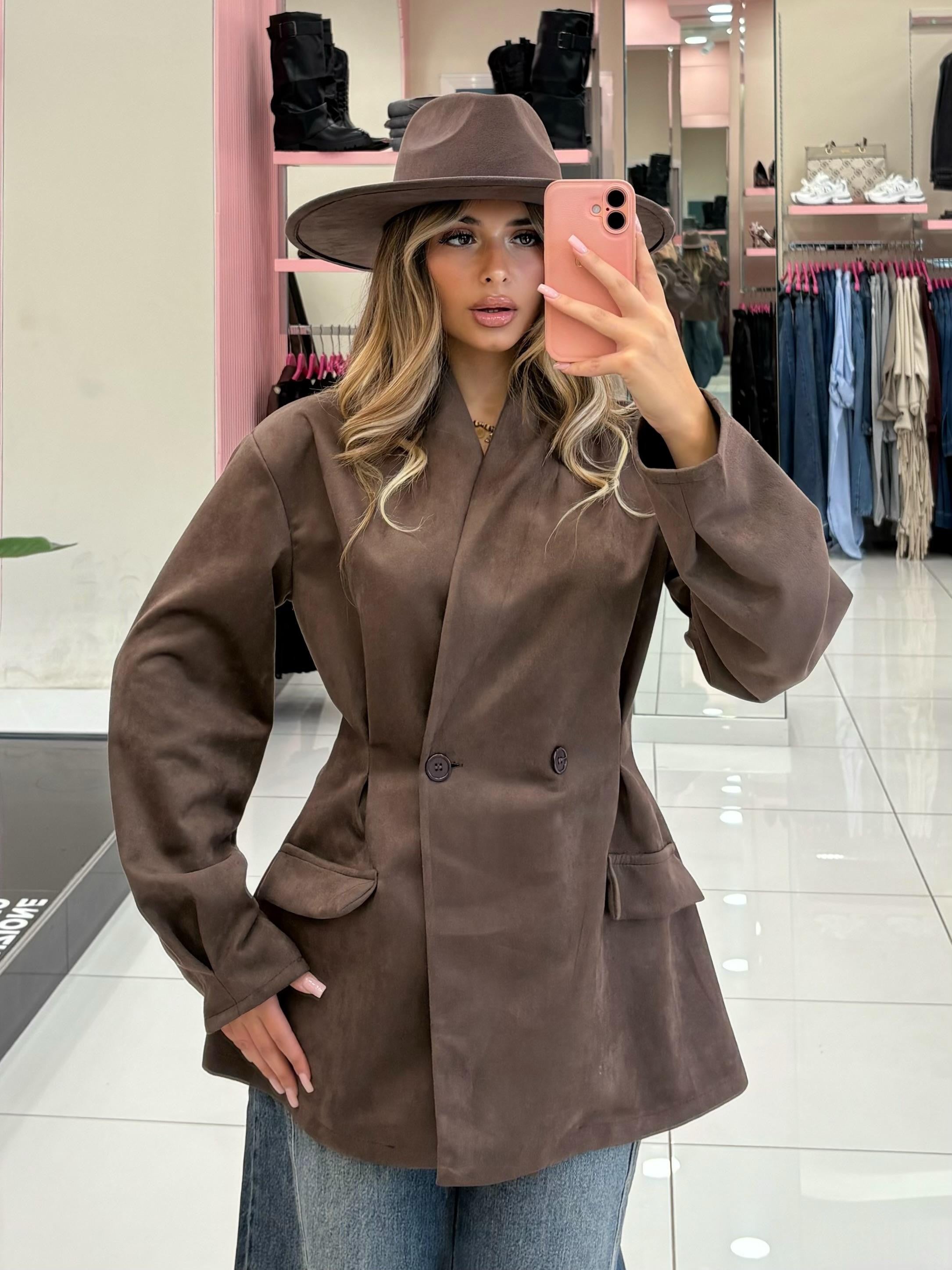 giacca collo coreano in camoscio manica palloncino doppio bottone, è possibile indossarla sia come abito che come giacca