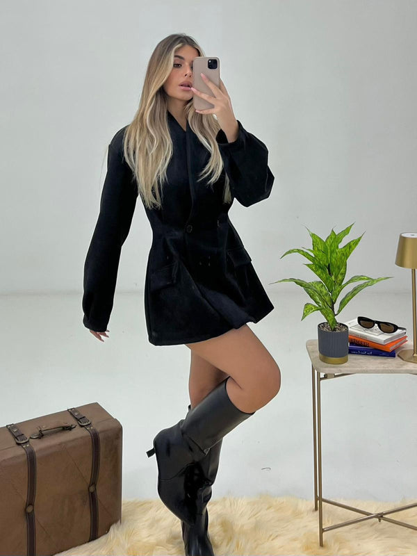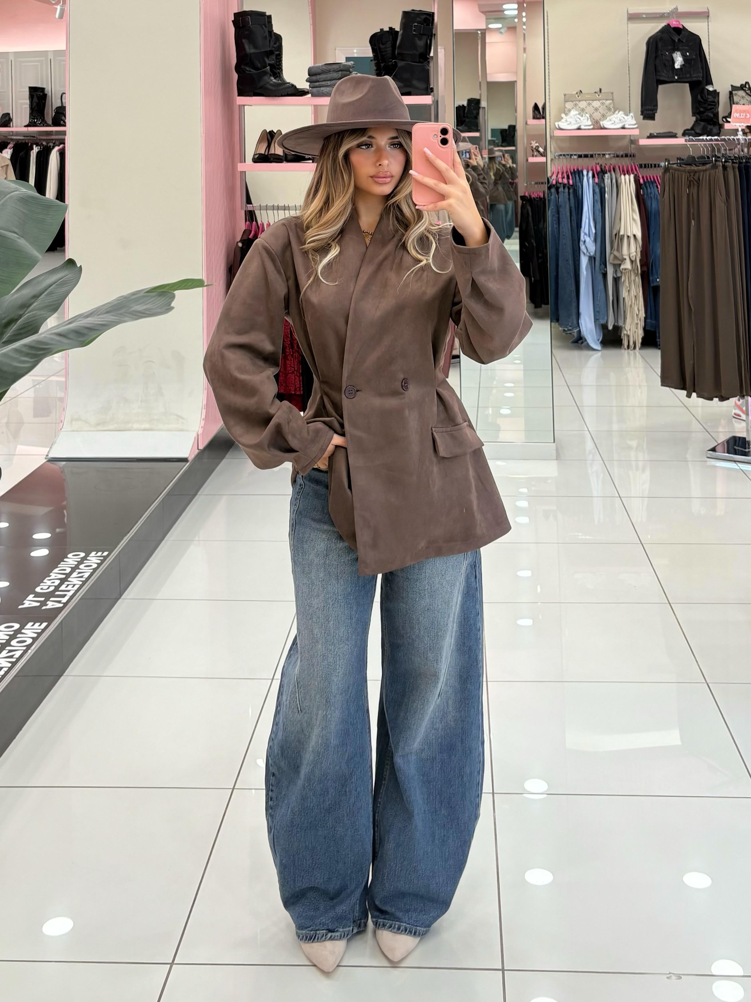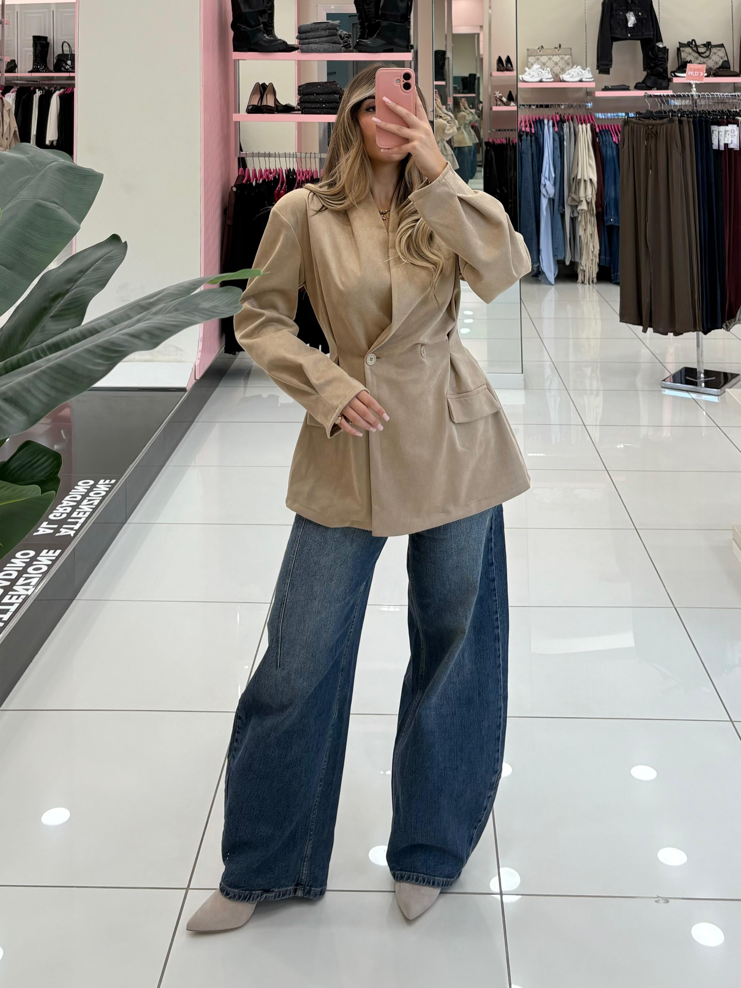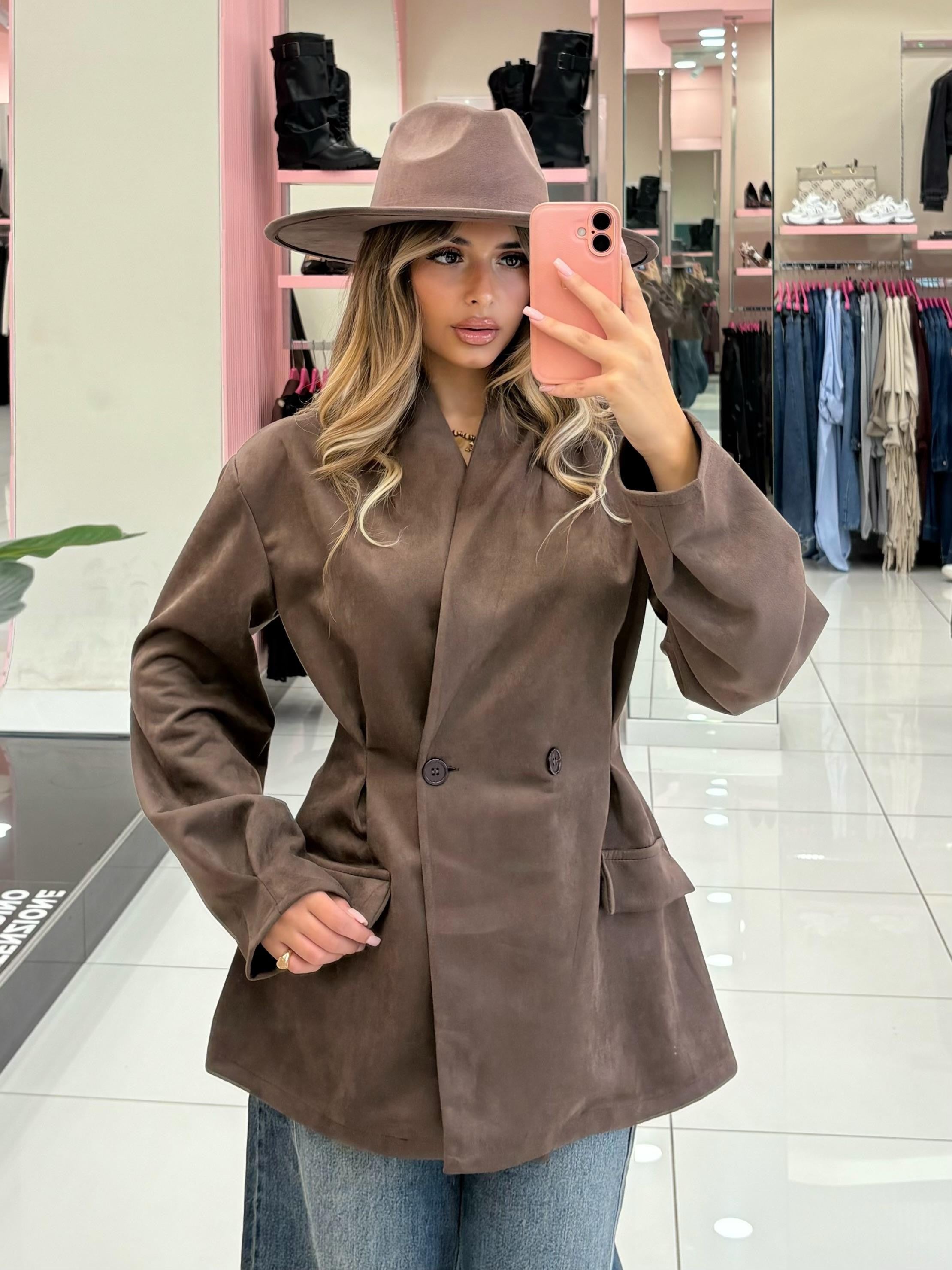 giacca collo coreano in camoscio manica palloncino doppio bottone, è possibile indossarla sia come abito che come giacca