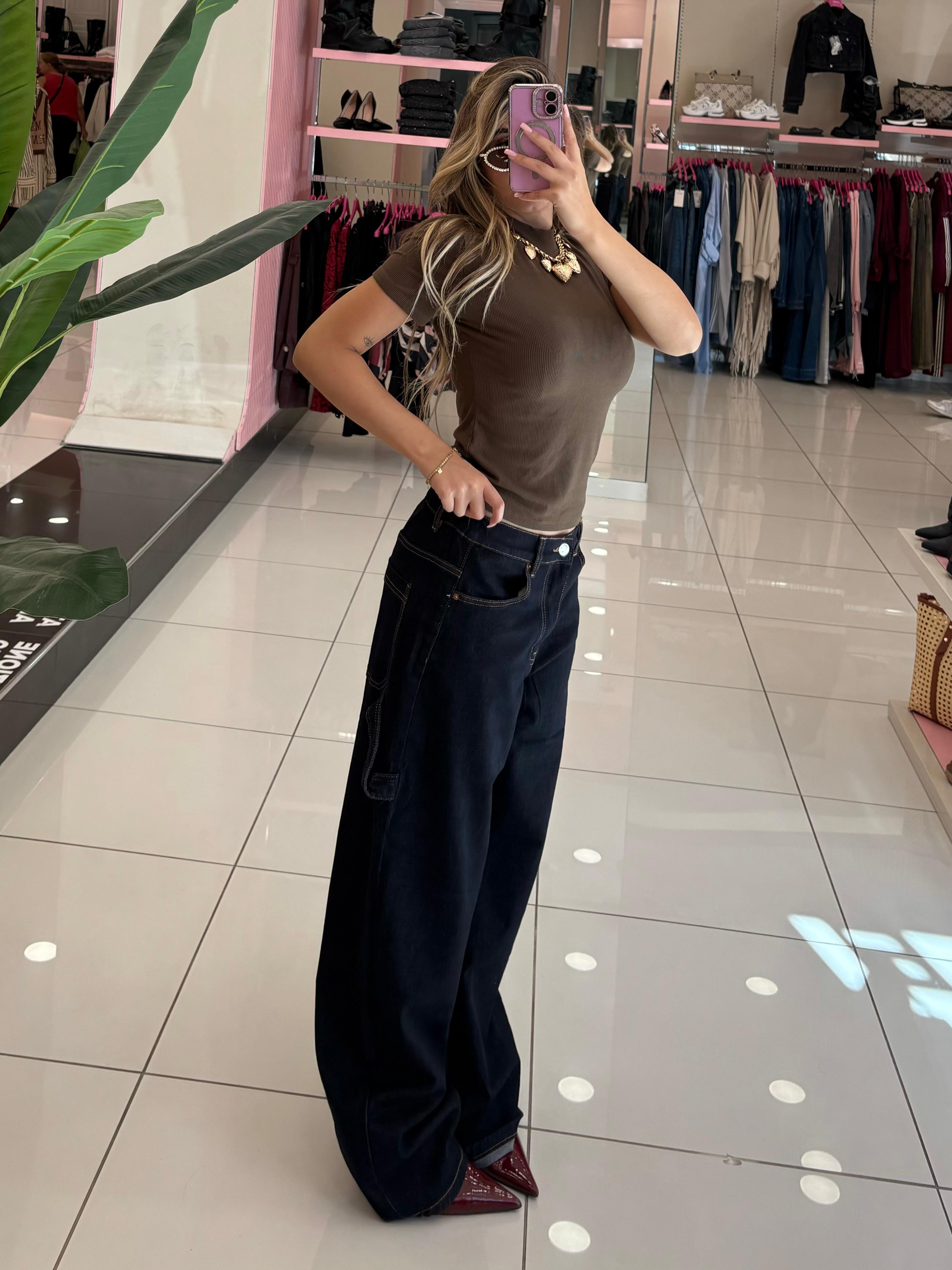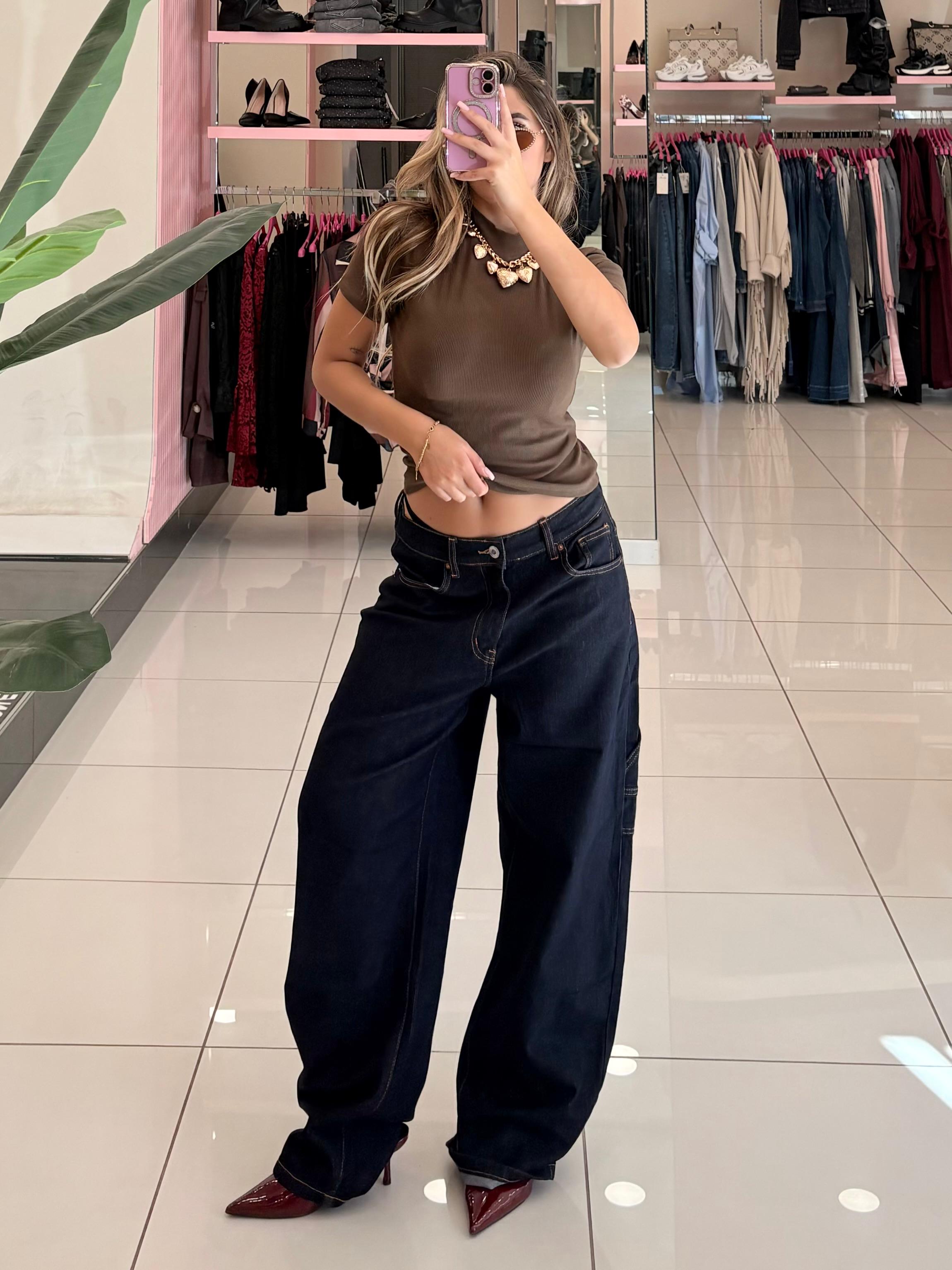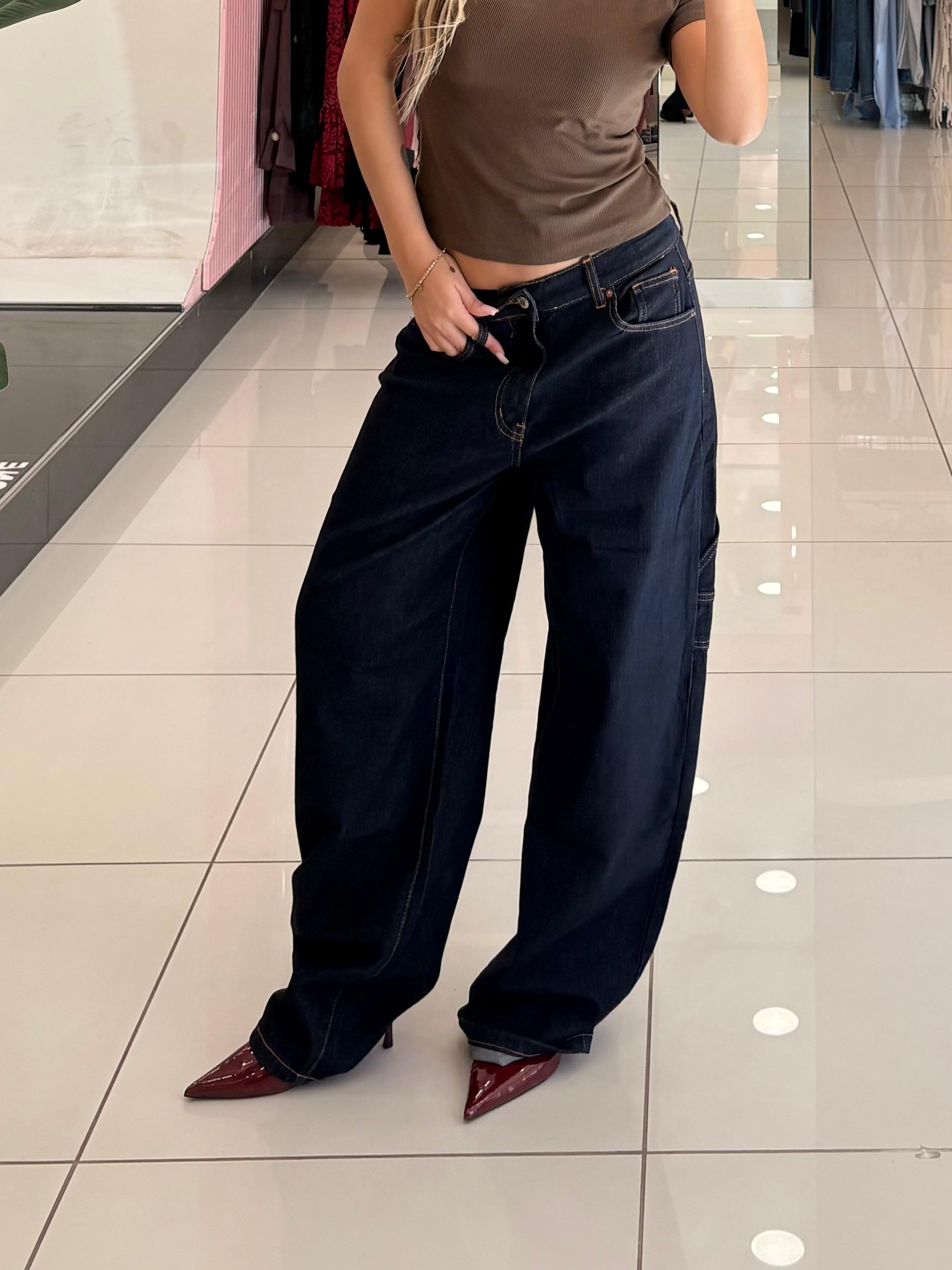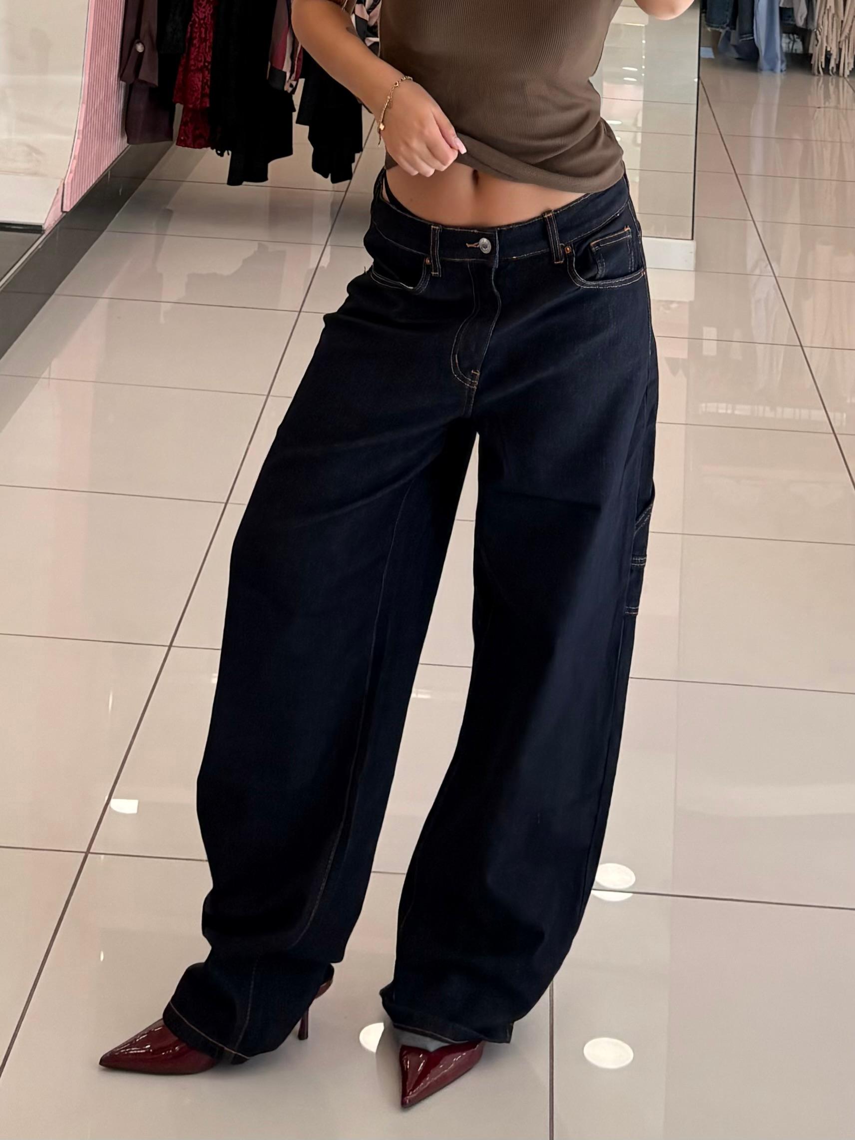 Jeans denim scuro, modello balloon con elastico posteriore in vita, tasche zip e bottone.