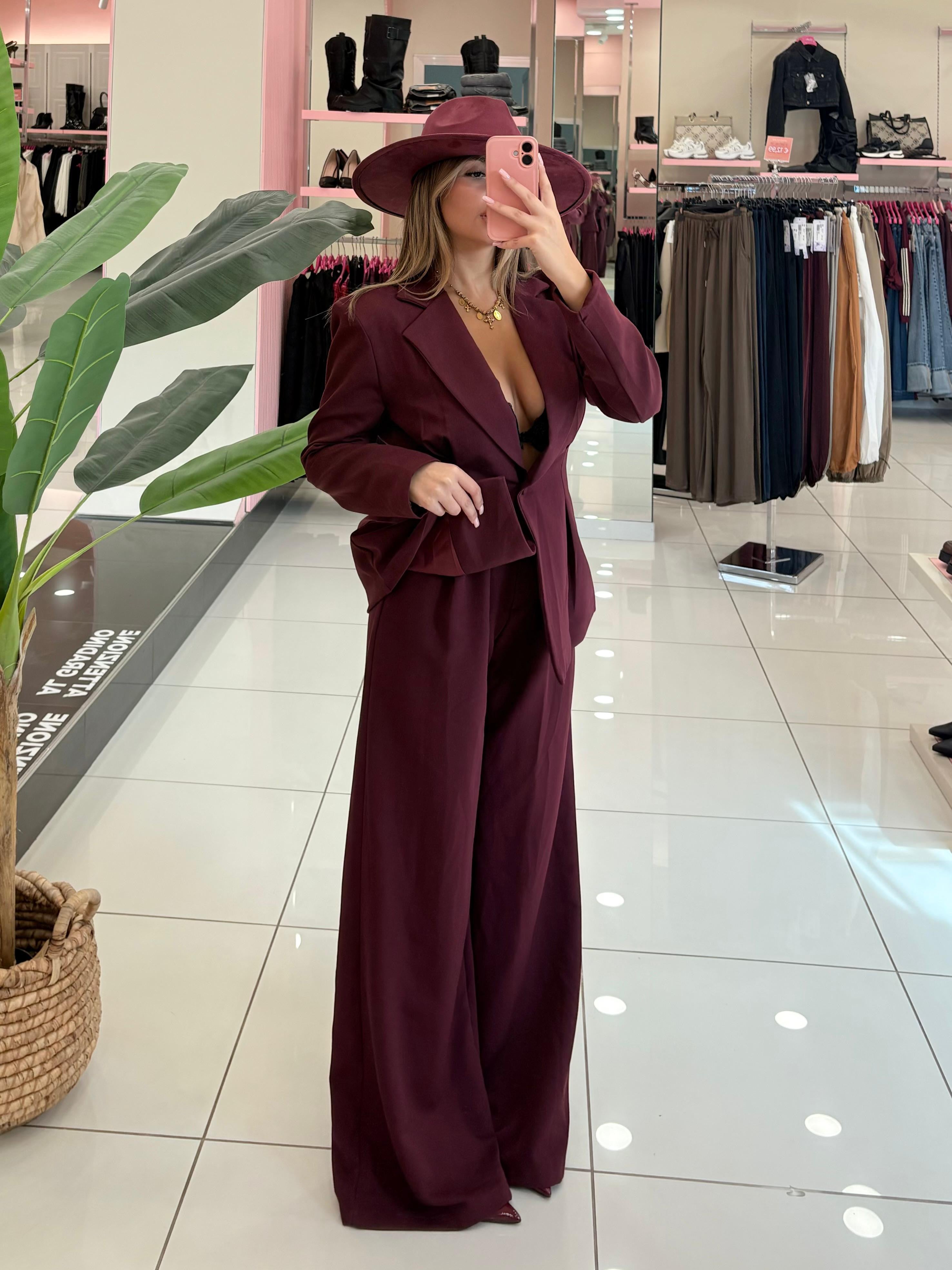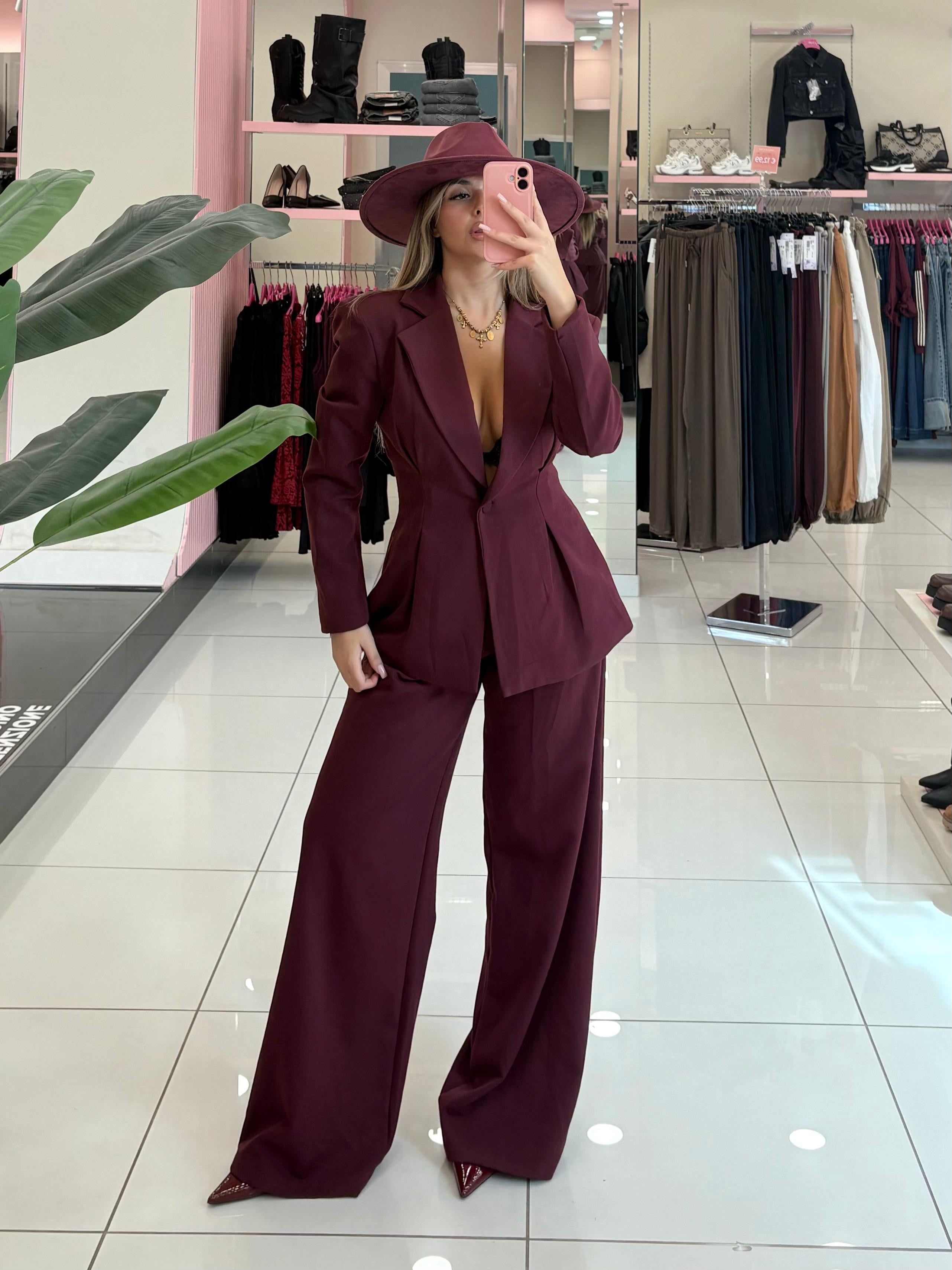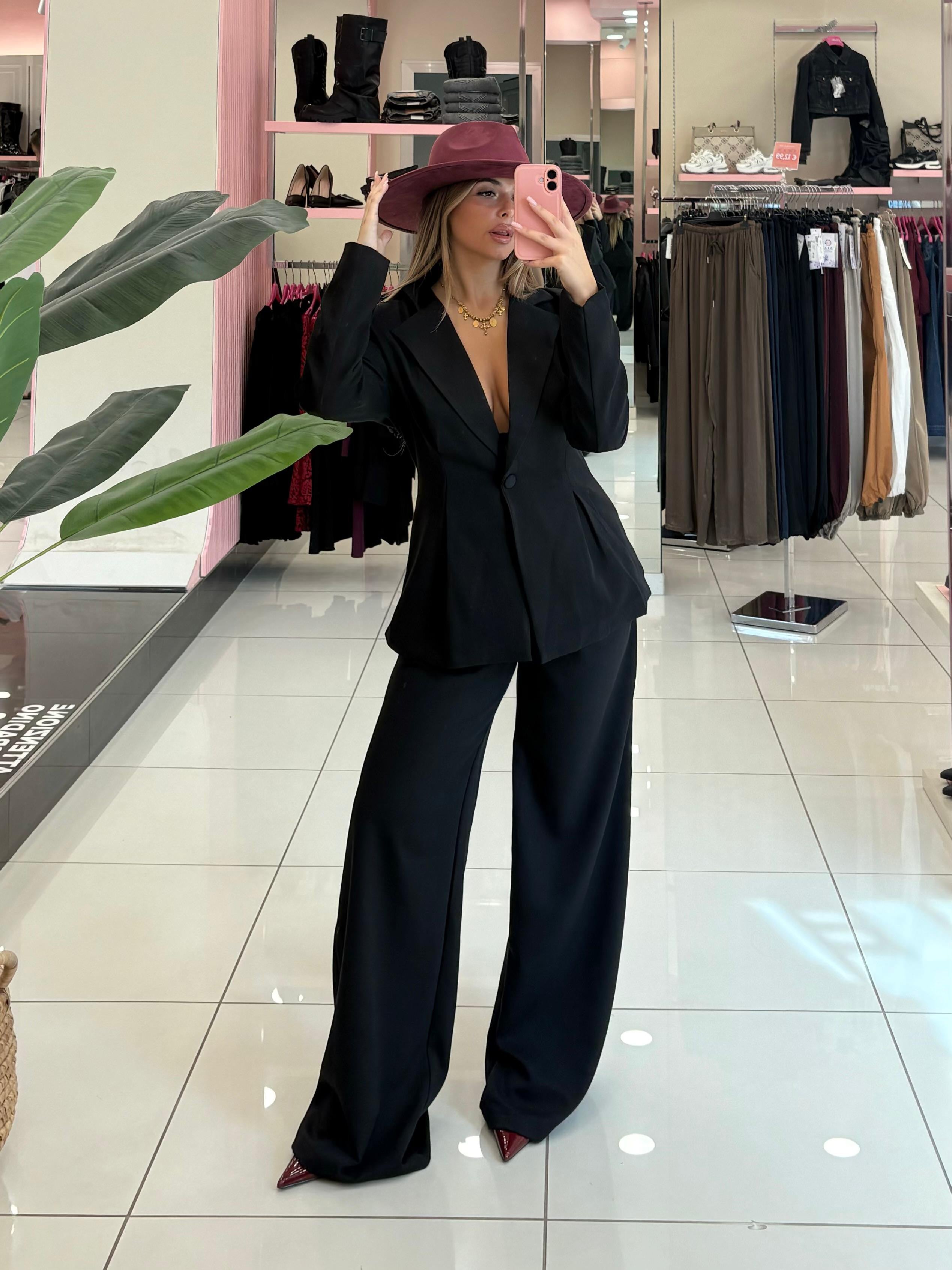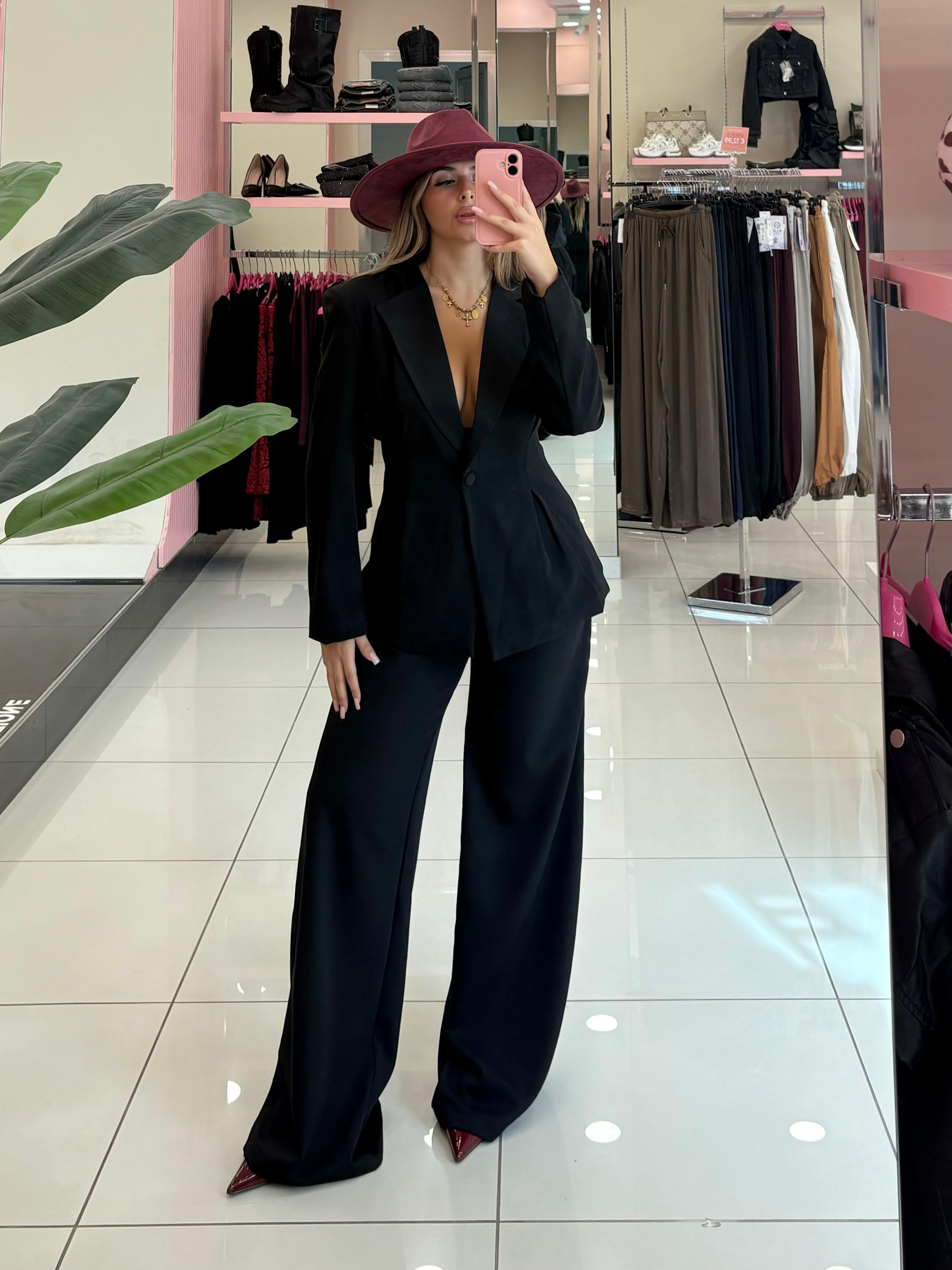 Completo composto da giacca avvitata un bottone con pences e pantalone palazzo con bottone ed elastico