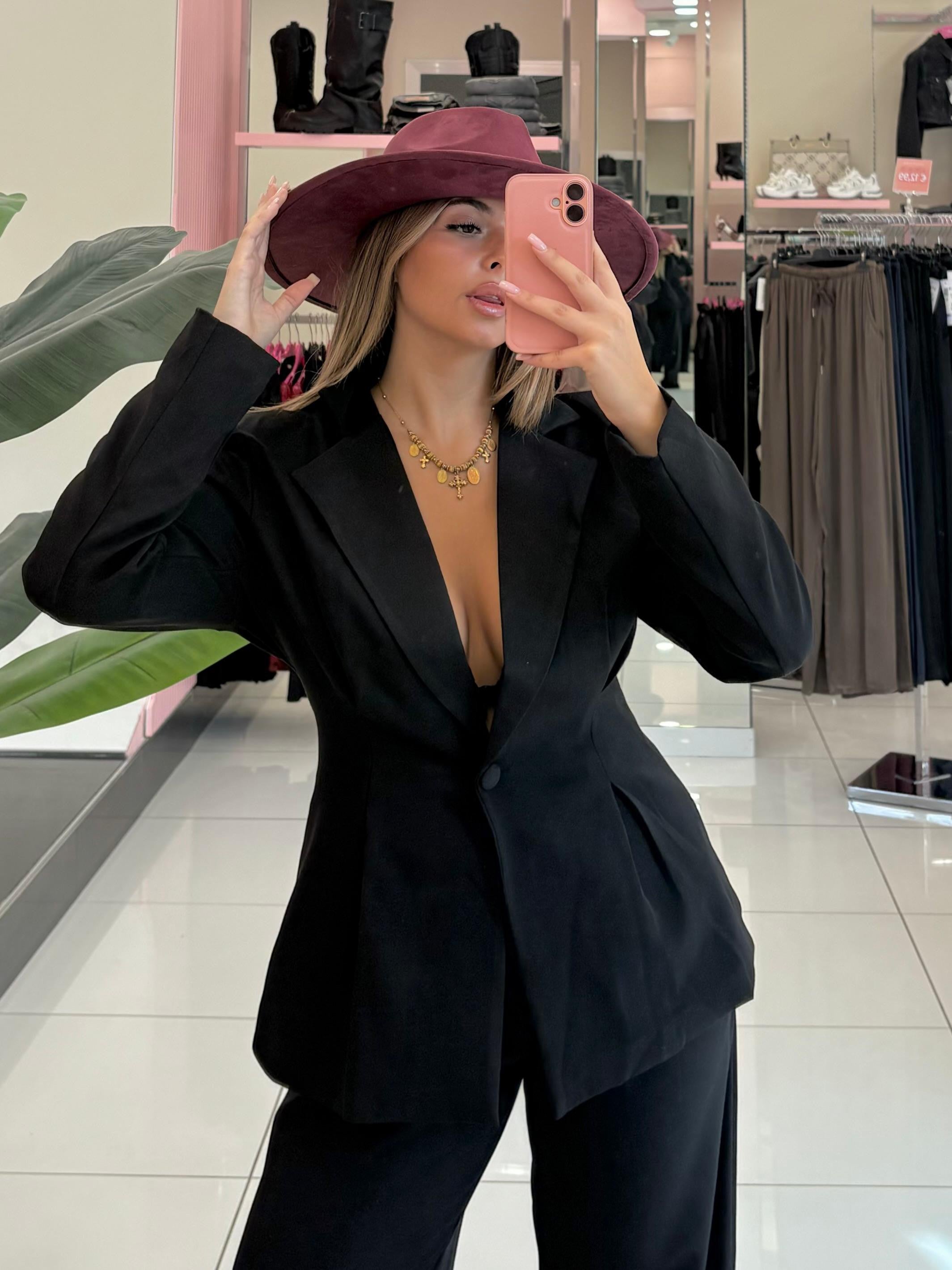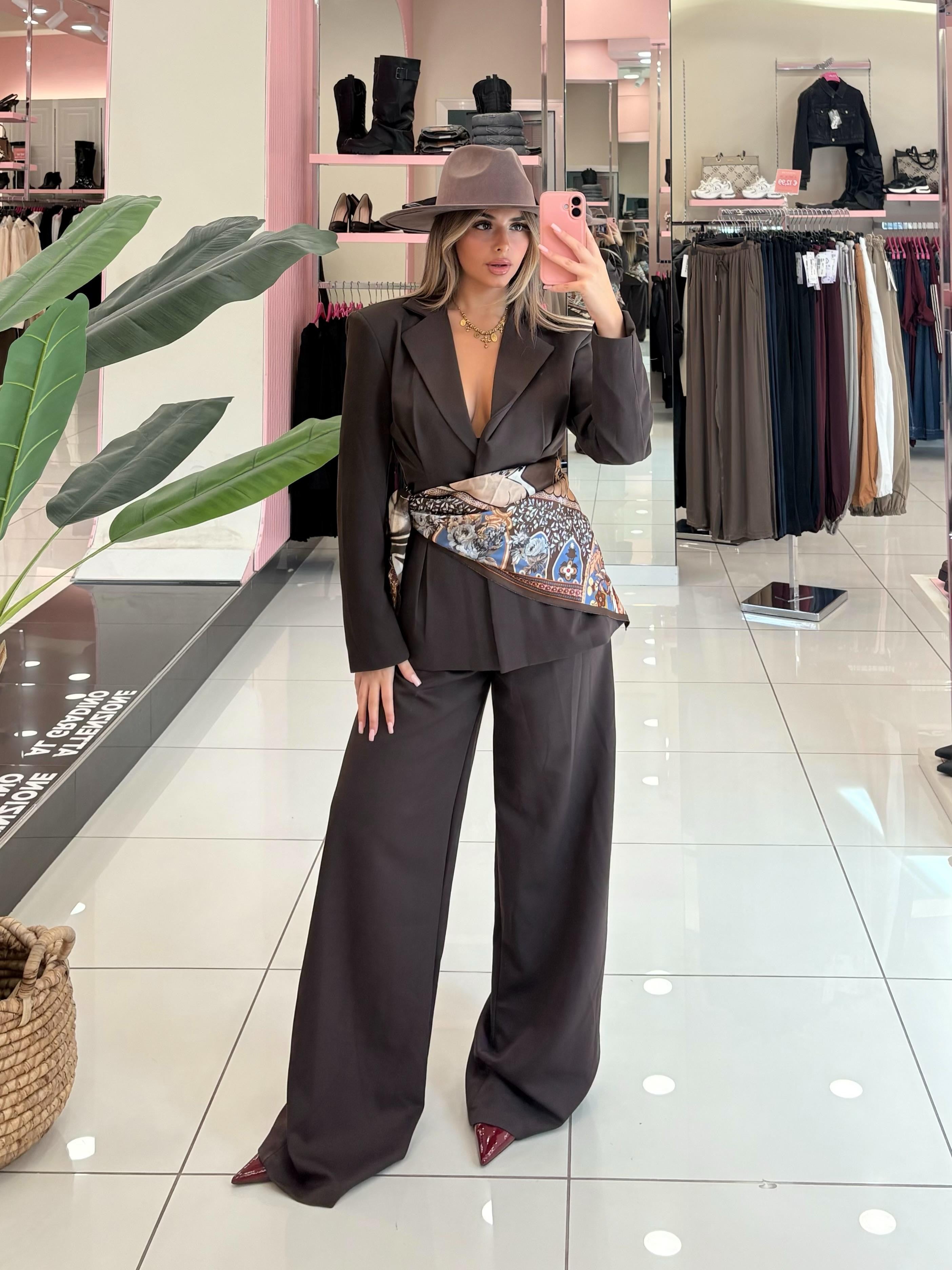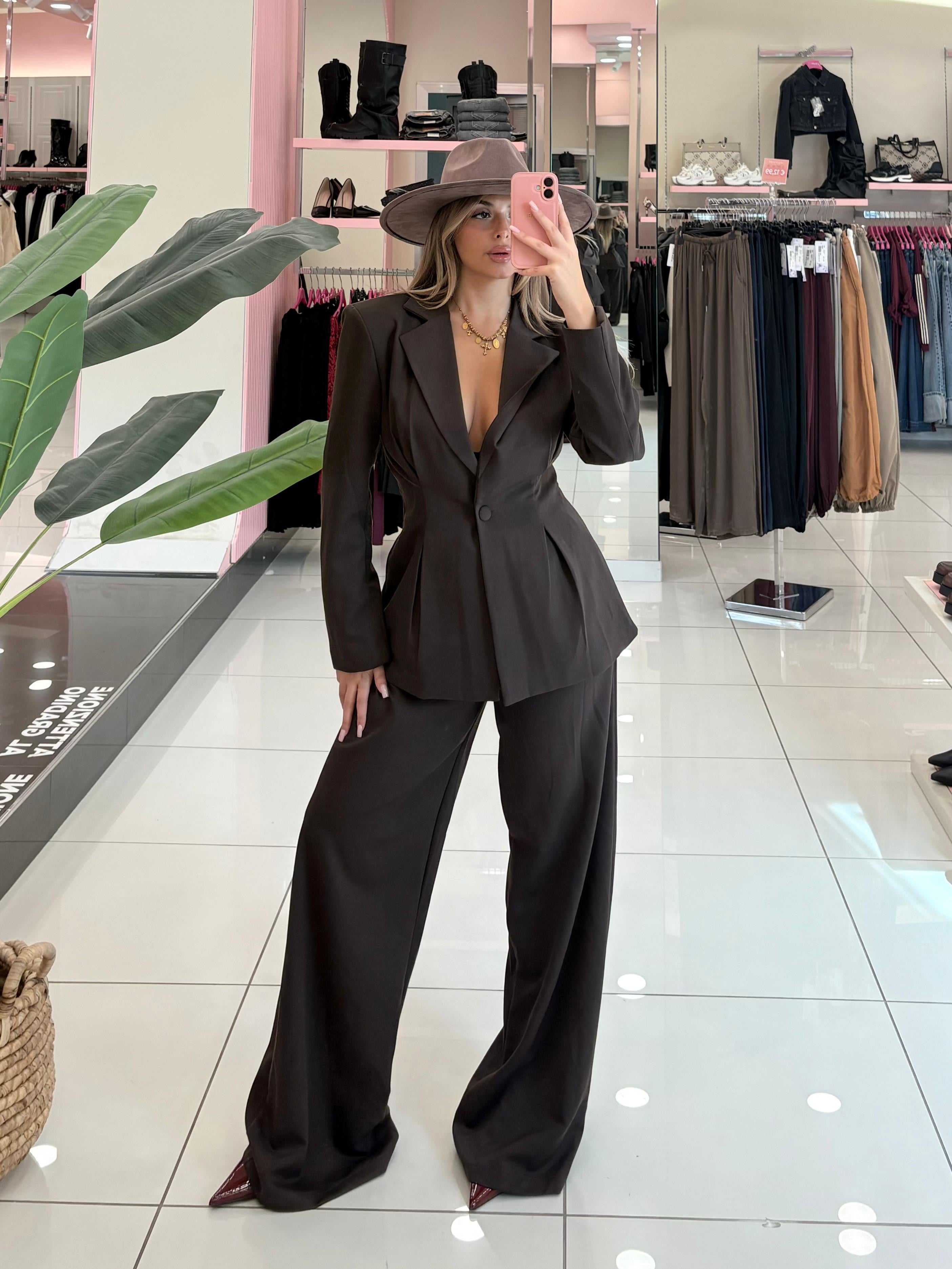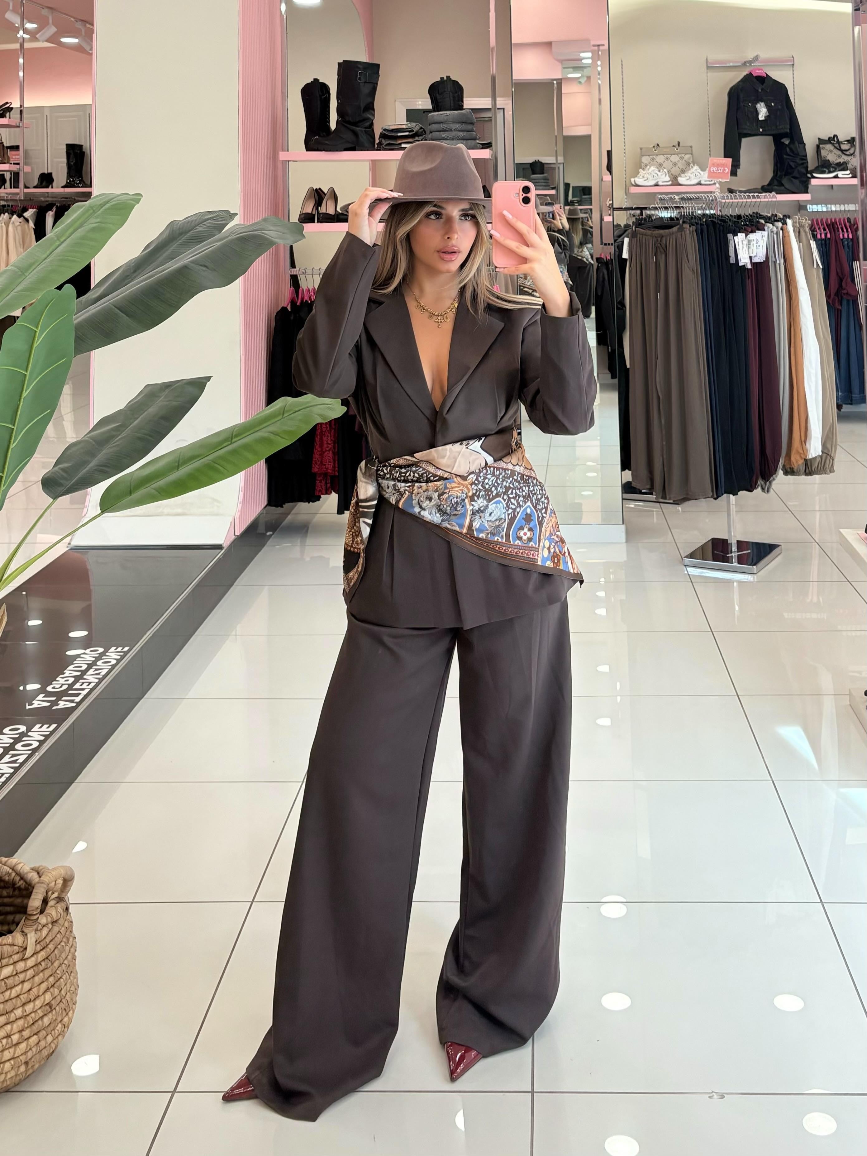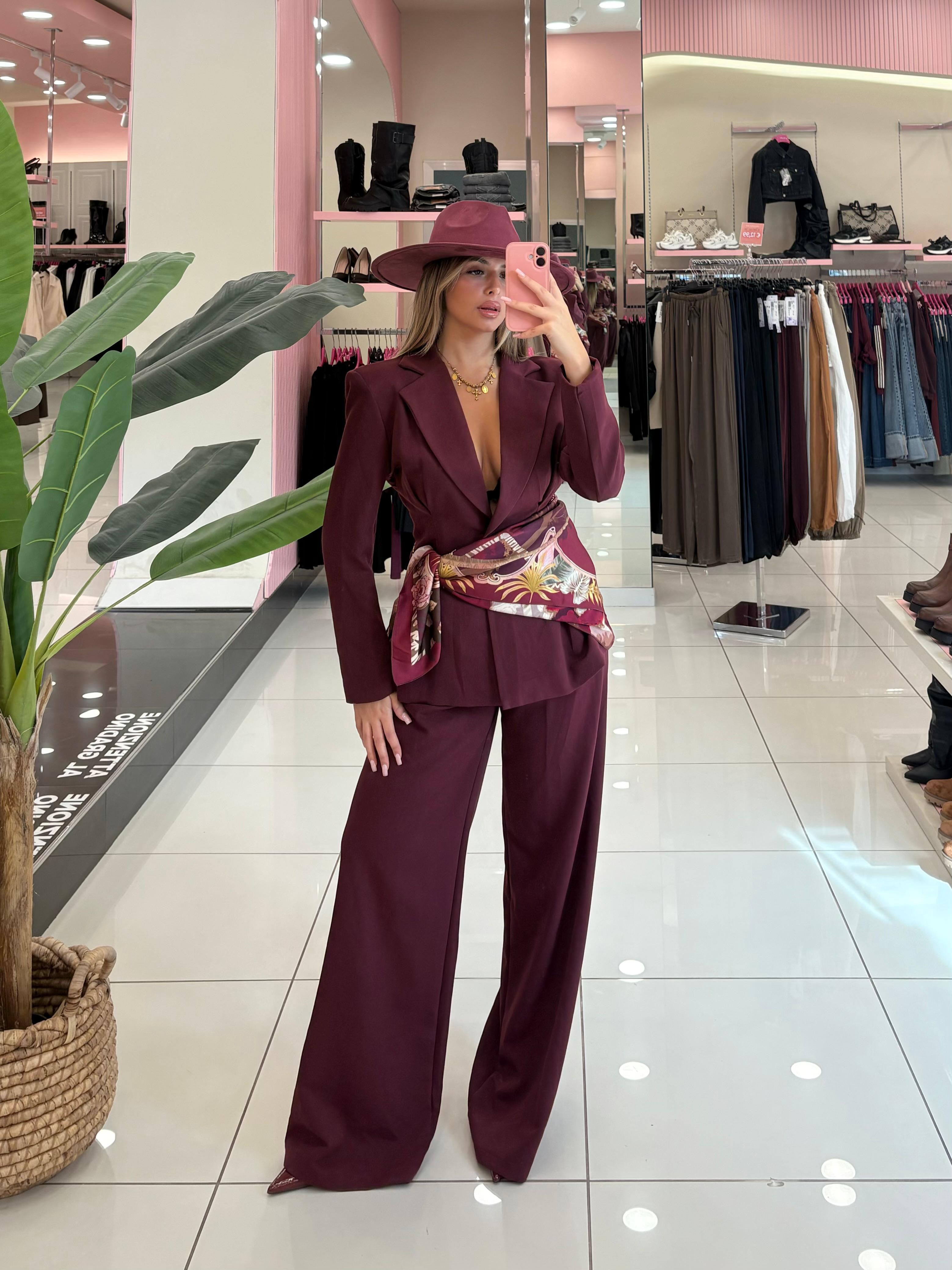 Completo composto da giacca avvitata un bottone con pences e pantalone palazzo con bottone ed elastico